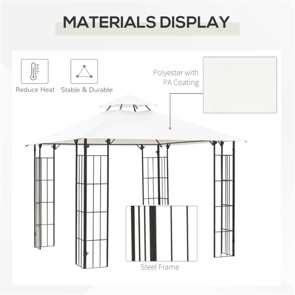 Features:- 2-tier vented rooftop, with PA coating for weather-resistant protective- Decorative frame supports in an ornate , for garden, lawn, deck and etc.- 180gsm polyester fabric material ensures a cool and comfortable feel- With 8 aluminum drainage holes to prevent weather damage- Powder-coated steel frame resists rust while providing stability- 8 ground stakes to ensure your gazebo is extra secure- Assembly requiredNote: Backyard gazebo is not a permanent structure and it's not guaranteed to against heavy rain, snow or windsSpecification:- Color: Cream White, Black- Material: Steel, Polyester- Coverage: 67 sqft- Roof Size: 10' L x 10' W- Top Height :8.5' H- Eaves Height: 6.6'Pieces Included:1 x gazebo8 x ground stake(Other demo items not included).Note:Due to different monitors and lighting effects, the actual colour of the product may differ slightly from the colour shown in the pictures. Thank you!Please allow 1-2 cm deviation due to manual measurement.The side wall of the net blocks unwanted guests with wings, and the side curtains can prevent wet environment.