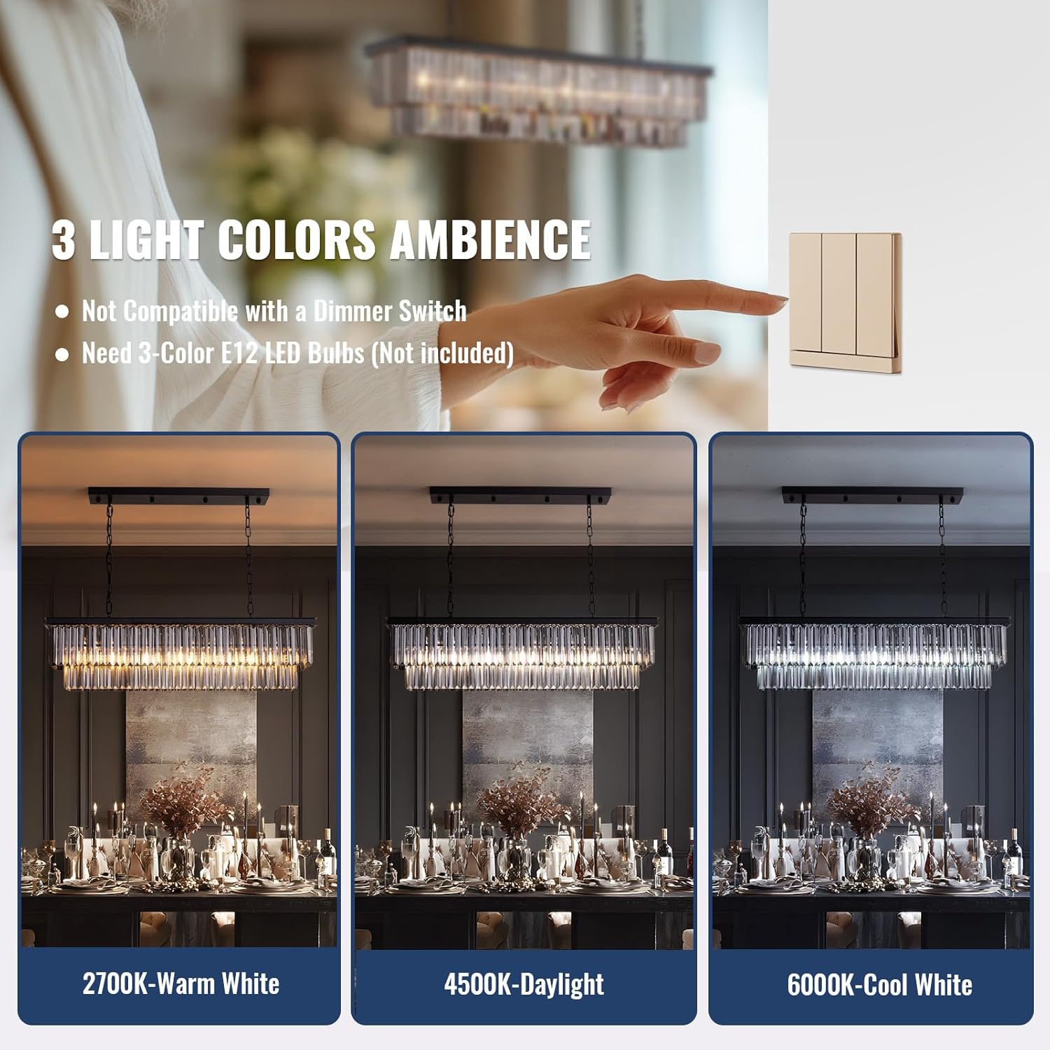 | Other Special Features of the Product | 3-color Dimmable Brightness Support, 59" Adjustable Hanging Chain, Dining Room Pendant Lighting, E12 Bulb Base, Vaulted Ceiling Compatible |