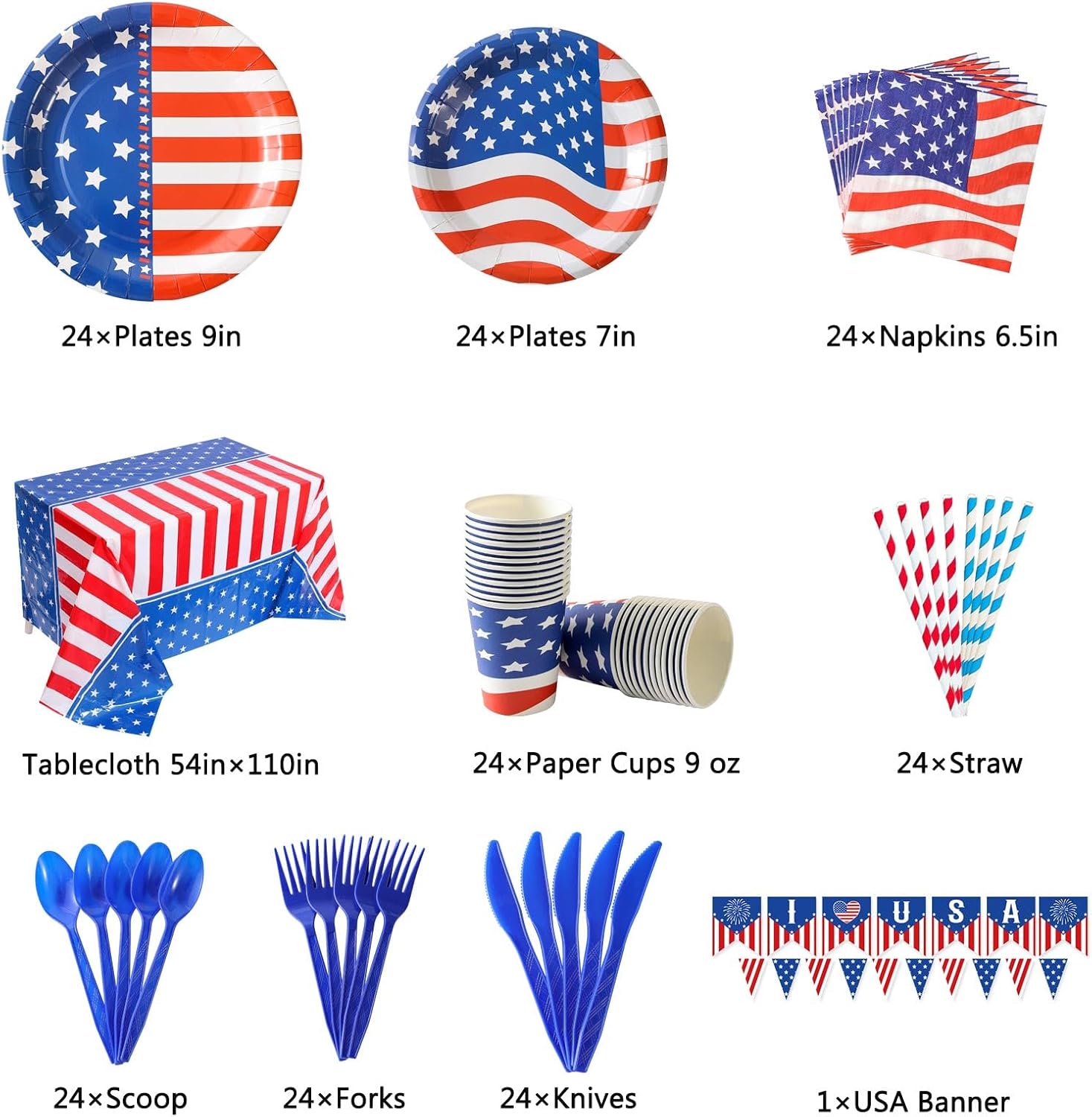 | Included Components | 24 x Dinner Plates (9’), Dessert (7’), Lunch Napkins (6.5’), Paper Cups (9 oz), Knives, Forks, Scoop, 1 Fourth of July Tablecloth (54”X110”), Banner |