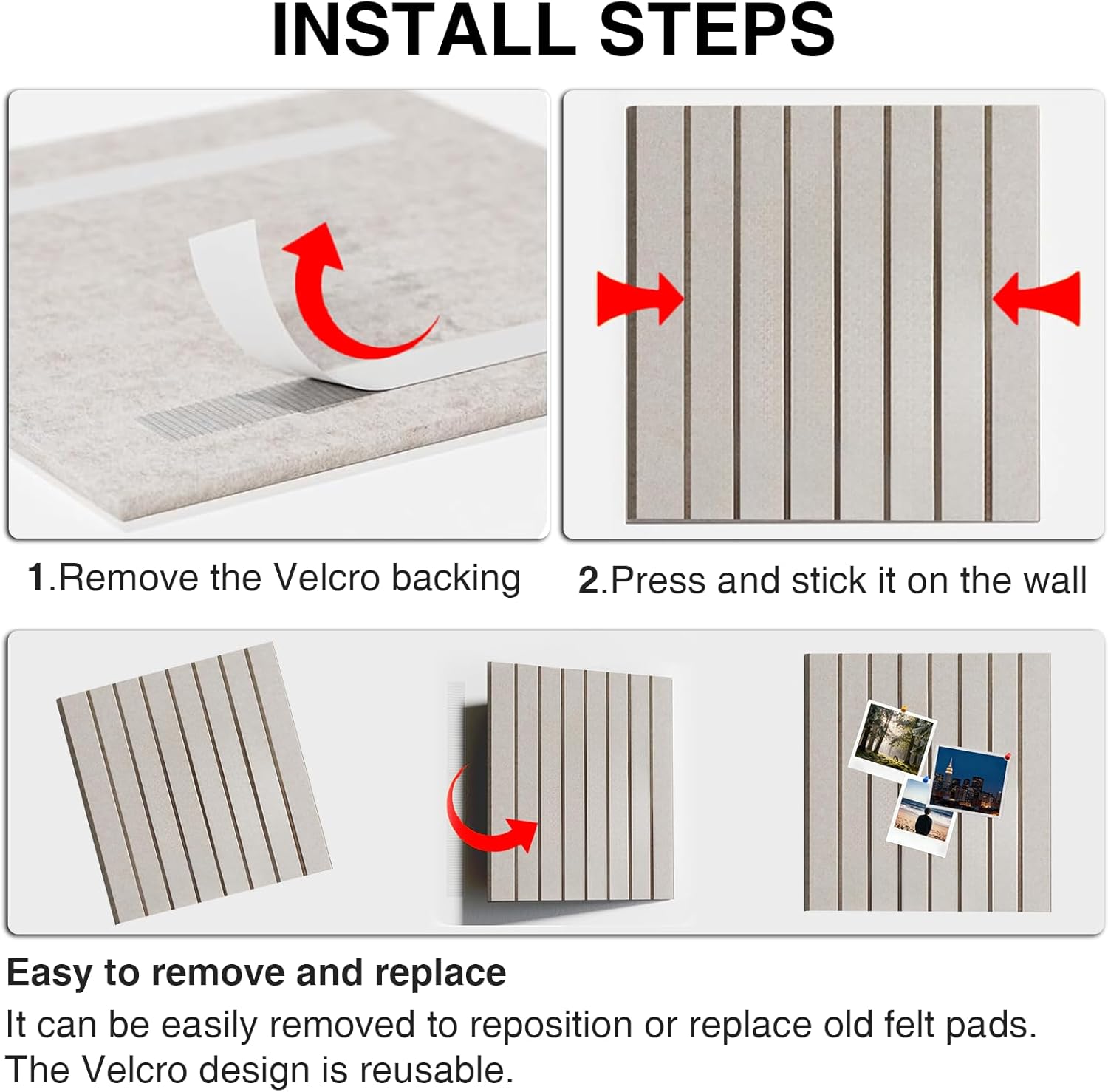 Large Bulletin BoardLooking for a better way to organize your space? Our large bulletin board makes it simple—what will you pin first?Highlights at a Glance:-- Set of 15 felt panels, each 11.8" x 11.8"-- Total display area: 59" x 35.4"-- High-density felt, stronger than cork-- Self-healing surface, always looks new-- Modern frameless style suits any space-- Tear-resistant and fire-retardant material-- 30 magic stickers for fast, secure mounting-- Lightweight and portable design-- Ideal for vision boards, notes, and photosSpecification:Material: Felt FabricIndividual Board Size: 11.8" x 11.8"Overall Dimensions: 59" x 35.4" (total coverage)Thickness: 0.35"Color Options: Black, Grey, CamelPacking List:15 x Bulletin Boards30 x Pushpins30 x Magic StickersFriendly Note:1. Easy Installation: Please follow the included instructions for wall mounting. Use proper hardware for your wall type to ensure secure installation.2. Suitable Pins: Use push pins or thumbtacks designed for bulletin boards. Avoid using sharp objects like nails or screws, which may damage the felt surface.3. Pin Placement: For best results, insert pushpins at a 45-degree downward angle to maximize load-bearing capacity.4. Gentle Cleaning: Clean the felt surface gently with a lint roller or soft brush. Avoid using harsh chemicals or abrasive materials.5. Pin Marks: Over time, frequent pinning in the same spot may cause holes or marks. To extend the board's life, change the pin position regularly.