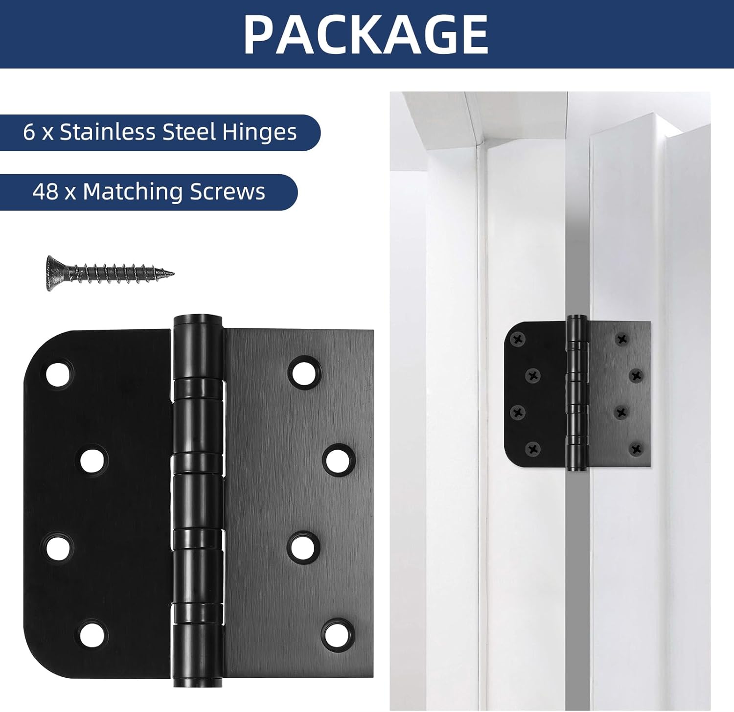 LITLANDSTAR Ball Bearing Door Hinges with Square & 5/8'' Round Radius Corners are made of high-quality stainless steel, and the surface is treated with an electroplating coating that features corrosion-resistant, moisture-resistant and aging resistance. They are tough enough to tightly fix the door, widely used in door frames, cabinets, shed windows, wooden boxes, shutters, skylights, vents, etc.. Feature: 1. Made of premium stainless steel with a matte black finish which is scratch-resistant and rust-proof, fits any extreme weather condition. 2. Built-in ball bearing provides much more silent and smoother use, providing additional security and durability. 3. Very simple and fast to complete the installation with the attached screws to get rid of aging door hinges. Specifications: Material: Premium Stainless Steel Size: 4" x 4" (102mm x 102mm) Thickness: 3mm Package Included: 6 x Heavy-Duty Door Hinge 48 x Matching Screw