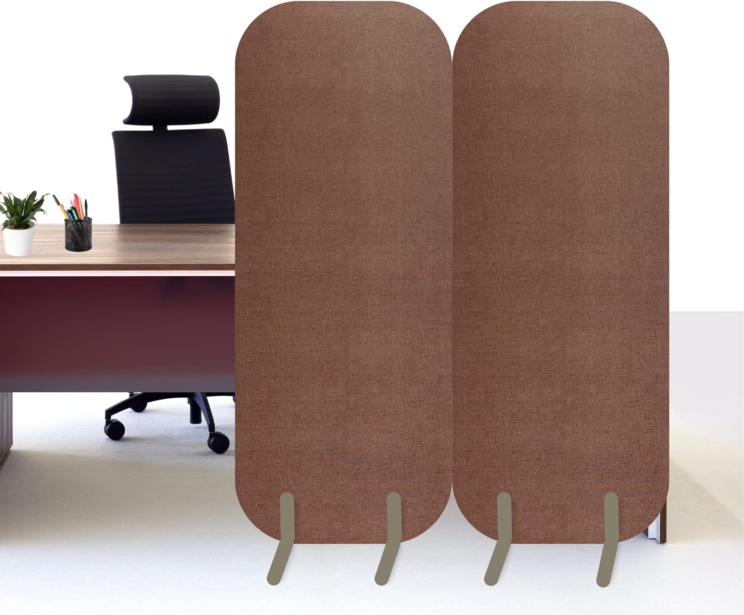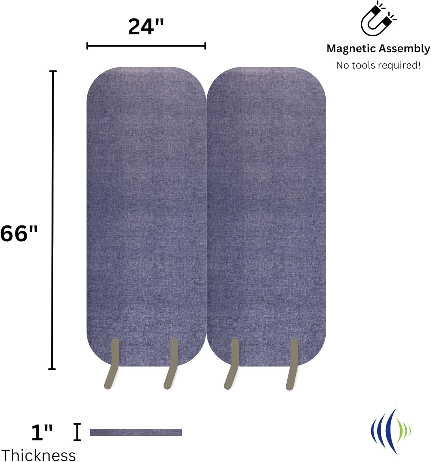 Blue office dividers, pack of two, are designed to offer a quick and easy acoustic solution in your home and/or office space where you need acoustic comfort. It is composed of acoustic glass wool boards upholstered with textured vinyl fabric and includes includes metal feet to stand freely within any space. Each panel is 63" tall and 23.5" wide. The internal magnets allow the panels to be placed directly next to one another to create a solid partition. Acoustic Comfort These room dividers can also be used as a sound absorber. Each space divider has a glass wool board as insulation, offering an optimal acoustic absorption for different environments. Don't have room, or would prefer not to remove or move your wall treatments currently on your walls but want sound absorption? These panels can be placed anywhere in the room! Easy to Install A lightweight product designed to be used in any space. Easy to install, it can be effortlessly relocated to the desired space and the internal magnet system allows configuration between panels to form acoustic barriers where needed Versatility The Acoustic Office Space Divider is available in 5 different colors; Grey, Yellow, Brown, Green and Blue. Designed as an ideal solution for restaurants, offices, meeting rooms, study room and any space where acoustic comfort is needed. High Resistance The textured vinyl fabric makes this a waterproof product with high resistance to wear and is highly UV resistant. Fire Safety These panels consist of Class A fire rated fiberglass board, covered with a vinyl cloth treated with fire retardant. Set comes with 2 acoustic panels and 4 metal feet