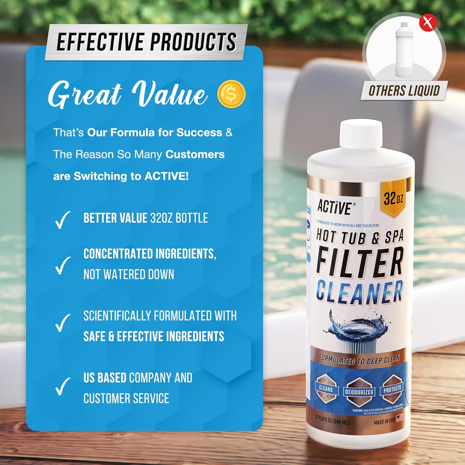 Bundle includes: 32oz Hot Tub & Spa Filter Cleaner and 24ct Washing Machine Cleaner. A full year supply of washing machine cleaning tablets and 32oz of hot tub filter cleaner. Introducing ACTIVE Pool, Hot tub, & Spa Cartridge Cleaner, the professional filter cleaners for hot tubs. Includes: 32 oz of Soaking Solution formula designed to penetrate grease, scale, oil, and buildups to extend the longevity of your cartridge filter. ACTIVE hot tub filter cleaners also work as a cartridge filter pool cleaner, and work with any size of pleated cartridge style filter. Just be sure to follow dilution instructions on package. Simple 12+ Hour soaking process works well to restore spa, hot tub, jacuzzi, swimming pool, or other water filters. It takes time to really get down to clean deep into the pleats of the cartrdige, plus it makes hot tub filter cleaning an easy, hands off process compared to another hot tub filter cleaner spray or spa cartridge cleaner for hot tubs. ACTIVE Hot tub Filer cleaner is formulated safely in the US from trusted chemicals and ingredients for your peace of mind. You can choose ACTIVE for your filter revive, pool filter cleaner soaking solution, and hot tub filter cartridge cleaner. Active Washing Machine Cleaning Tablets are essential to routine service of your washer. Laundry machines slowly build up grime, soap scum, calcium, lime with every use. Active Tablets refresh your machine and penetrate these grimes so that your washer can shine and your clothes keep smelling clean! It's best to use two treatments (1 Tab Per Treatment) each month for maximum results. Simply insert a tablet into the drum of the washer (NOT IN DETERGENT CONTAINER) and run machine with hot water or self-cleaning mode if you are using newer machine.
