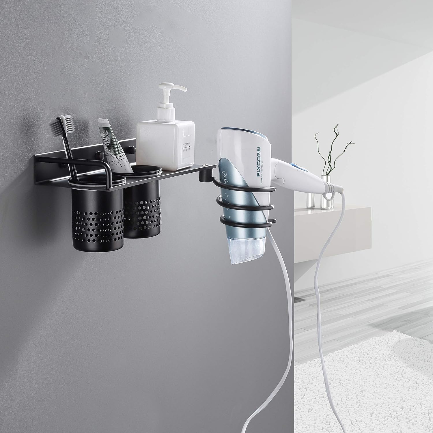 Bathroom Blow Dryer Holder Hair Tools Organizer SPECIFICATIONS Type: Hair Dryer Holder with Storage Shelf Material: Aluminum Finish : Anodizing Color:Matte Black Package Weight: 1.14lbs(0.52 KG) Installation Method : Drill Free or Wall Mounted with Screws What you will get: 1×Holder Frame and 2×Storage Cups 3×Self Adhesives&Fittings 3×Screw Mounting Accessories Where are suitable for No Drilling Glue -Glazed tiles -Uneven tiles -Glazed marble -Uneven marble -Glazed glass -Dull polish glass -Glazed metal -Uneven metal -Wooden wall Where are not suitable for No Drilling Glue ? -Oil paint wall -Parget wall -Cement wall -Wallpaper