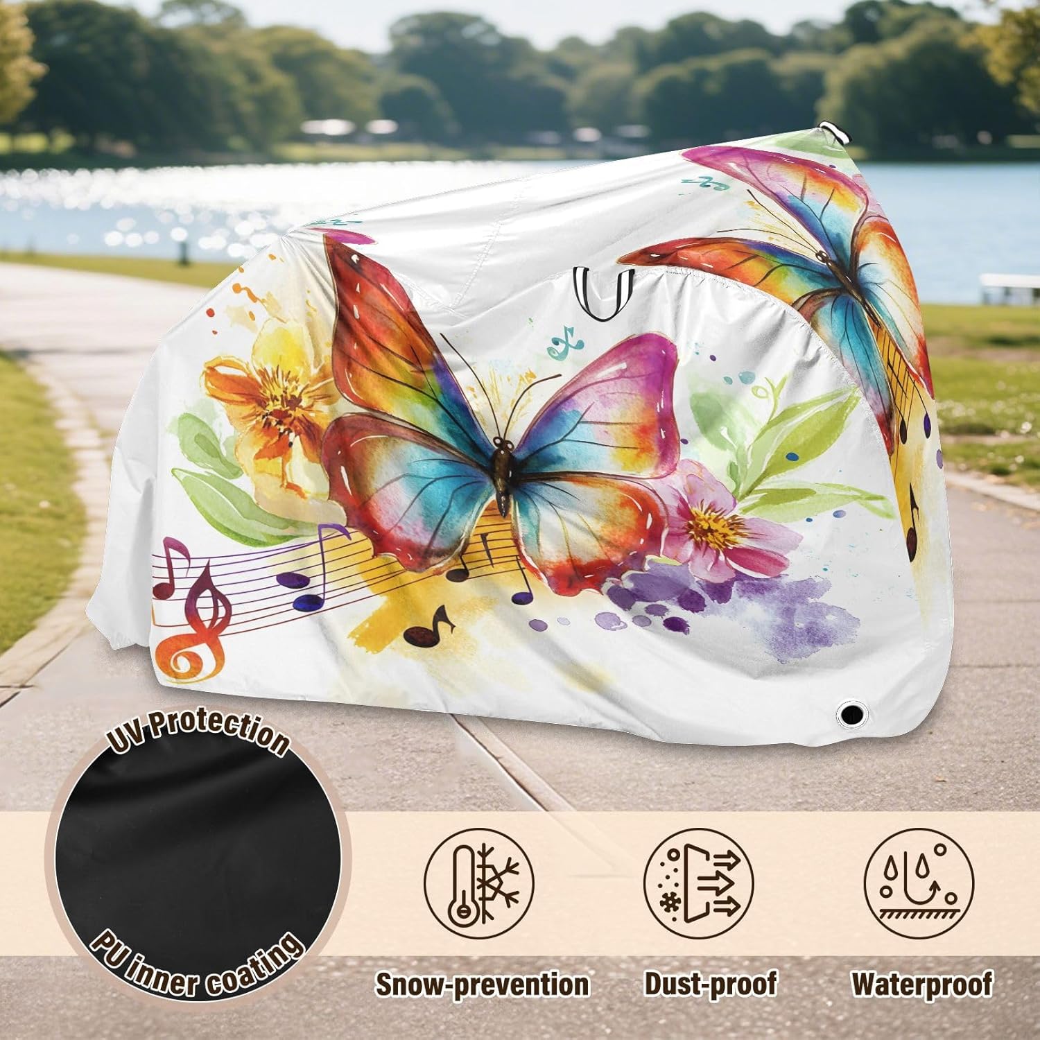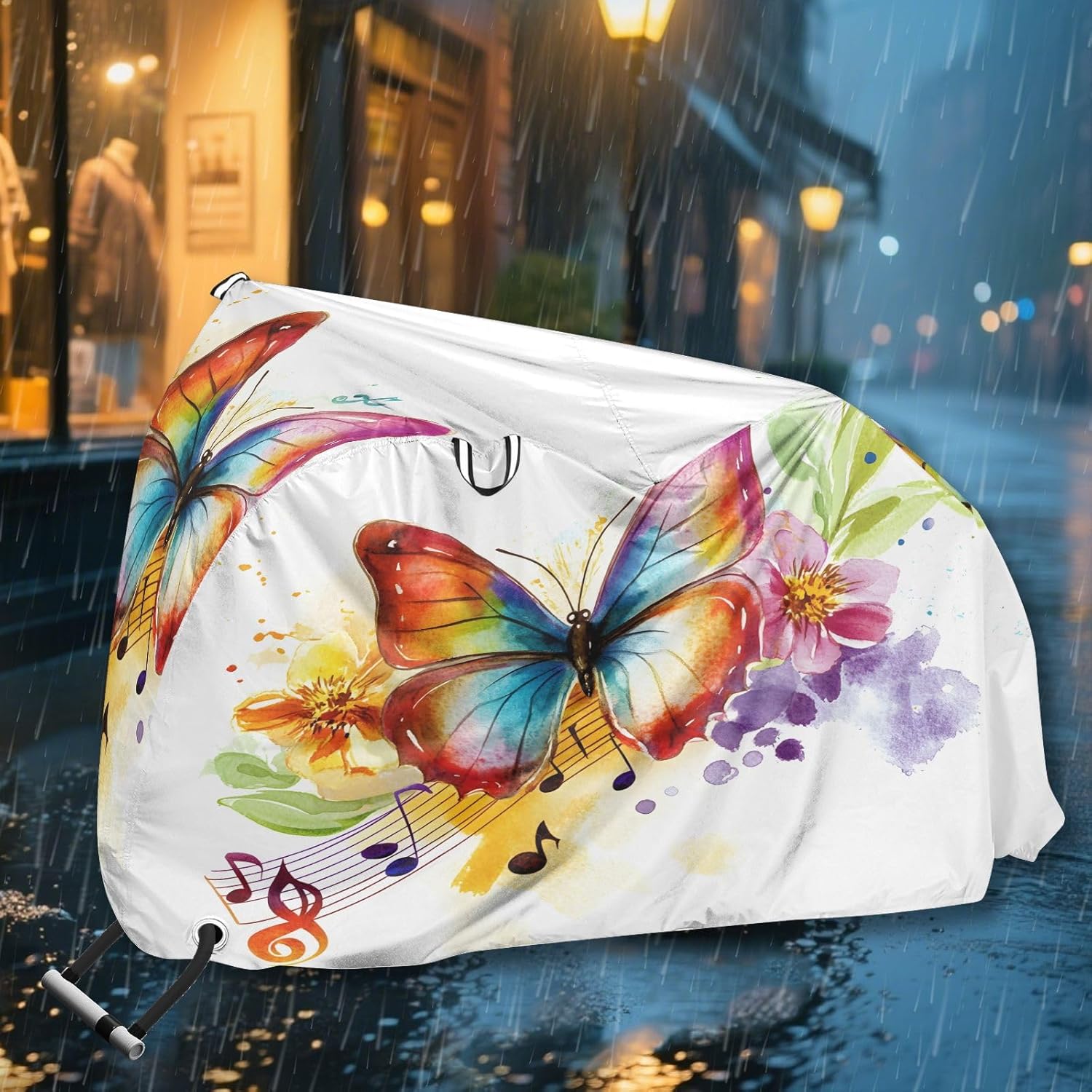 Protect your bicycle in style with our premium bike tarp, engineered for maximum defense against harsh elements. Unlike basic covers, we use specially engineered umbrella waterproof fabric - the same advanced material used in high-end rain umbrellas - delivering superior performance with unique visual appeal. Sun & Heat Defense Our fabric creates a physical cooling barrier that actively lowers your bike's temperature by: Blocking 95%+ harmful UV rays to prevent paint fading Providing exceptional shading & heat insulation (up to 20℉/11℃ reduction vs direct sun) Offering SPF 50+ equivalent protection for sensitive components Rain & Dust Protection Water-repellent coating causes rain to bead and roll off Tightly woven fabric acts as dustproof barrier for long-term storage Prevents moisture buildup with breathable side panels (prevents condensation) User-Focused Design LOCK ACCESS HOLE at front wheel enables secure locking without removing cover ADJUSTABLE BUCKLE STRAP at rear wheel anchors cover during strong winds Reflective safety strips on handles enhance nighttime visibility Ultra-lightweight (23 oz) folds into included pouch Unbeatable Aesthetics Choose from over 1,000 designer patterns - from sleek geometrics to vibrant nature motifs - transforming your bike into a street-style statement while competitors offer only solid colors.