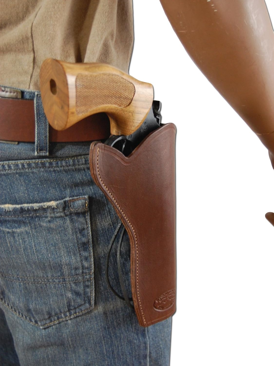PREMIUM COWHIDE LEATHER 49-er Style WESTERN HOLSTER made with precision stitching. Premium Leather STRAIGHT DRAW Revolver Holster. Lightweight (only 8 oz) and is made in the USA. Made from U.S. double shoulder 8-9 oz. weight cowhide. It will accept belts up to 3" wide. Forty-niner style; quick-draw, straight-draw holster with adjustable hammer retention. The photos show a right hand draw holster.