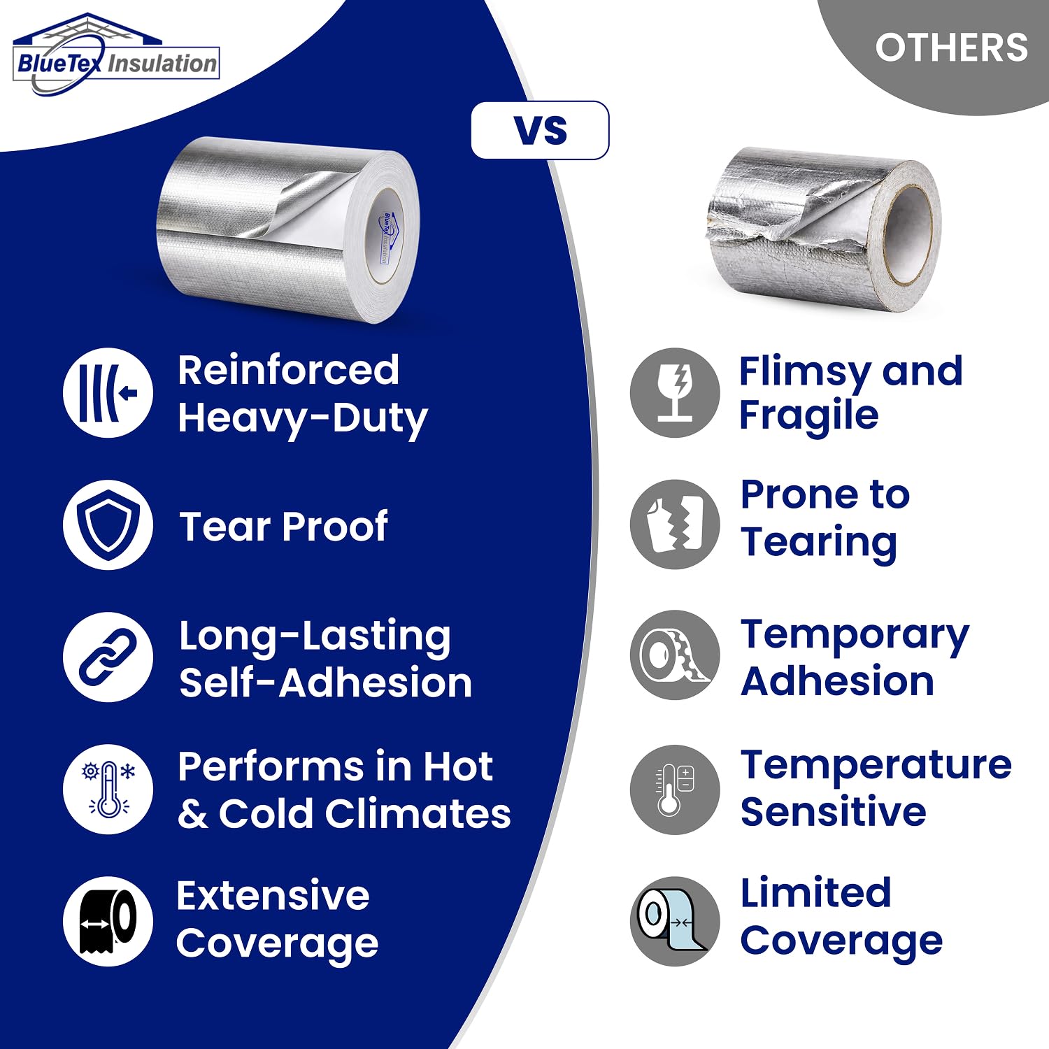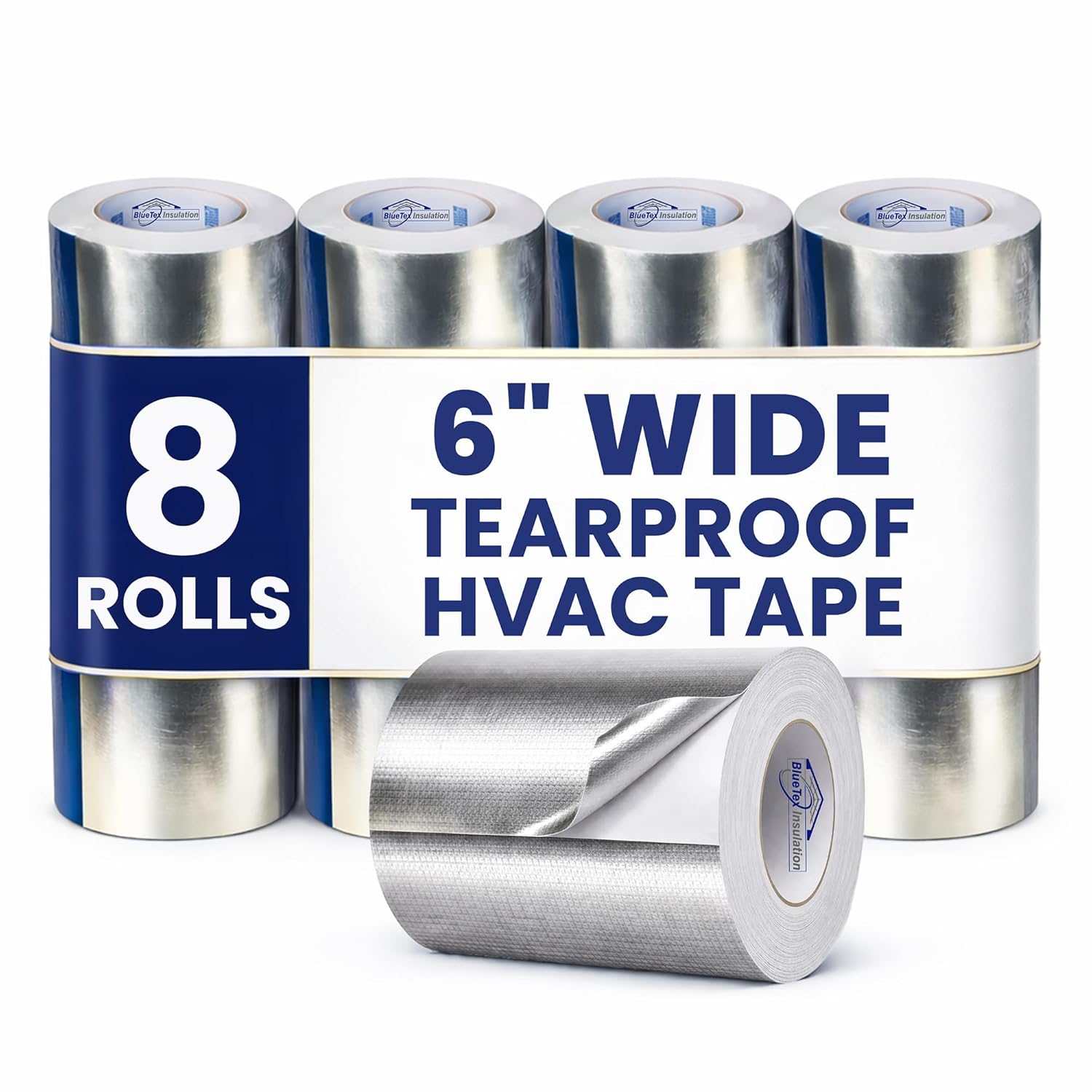 BlueTex Foil Tape is the perfect combination of multi-functionality and extreme durability. Engineered to meet the toughest demands, this metal duct tape is designed specifically for use with heavy-duty radiant barrier and metal building insulation products. You can't easily rip or tear this HVAC duct insulation wrap—it cuts only with a blade, ensuring it withstands even the most extreme conditions and environments. Why Choose Us:Ultimate Strength: Featuring an internal woven tear-proof scrim/tarp-like fabric, this HVAC duct sealant tape is far stronger than any foil-only tape. The scrim is bonded to pure aluminum foil (not mylar), giving it unmatched strength and durability. Reflective Power: The aluminum foil backing can reflect up to 97% of radiant heat, making it ideal for applications where heat resistance is crucial. All-Weather Resilience: BlueTex Foil Tape is built to handle anything nature throws at it. It’s moisture-resistant, UV-resistant, and weather-resistant, including when used in direct sunlight. Easy Application: While incredibly strong, this silver tape for ductwork is still easy to cut with a blade, making it practical and convenient for various applications. BlueTex is proud to be a US-owned and operated small business. We have live customer service phone support Monday - Friday. Shop local, shop small, and trust BlueTex for reliable performance in every roll.