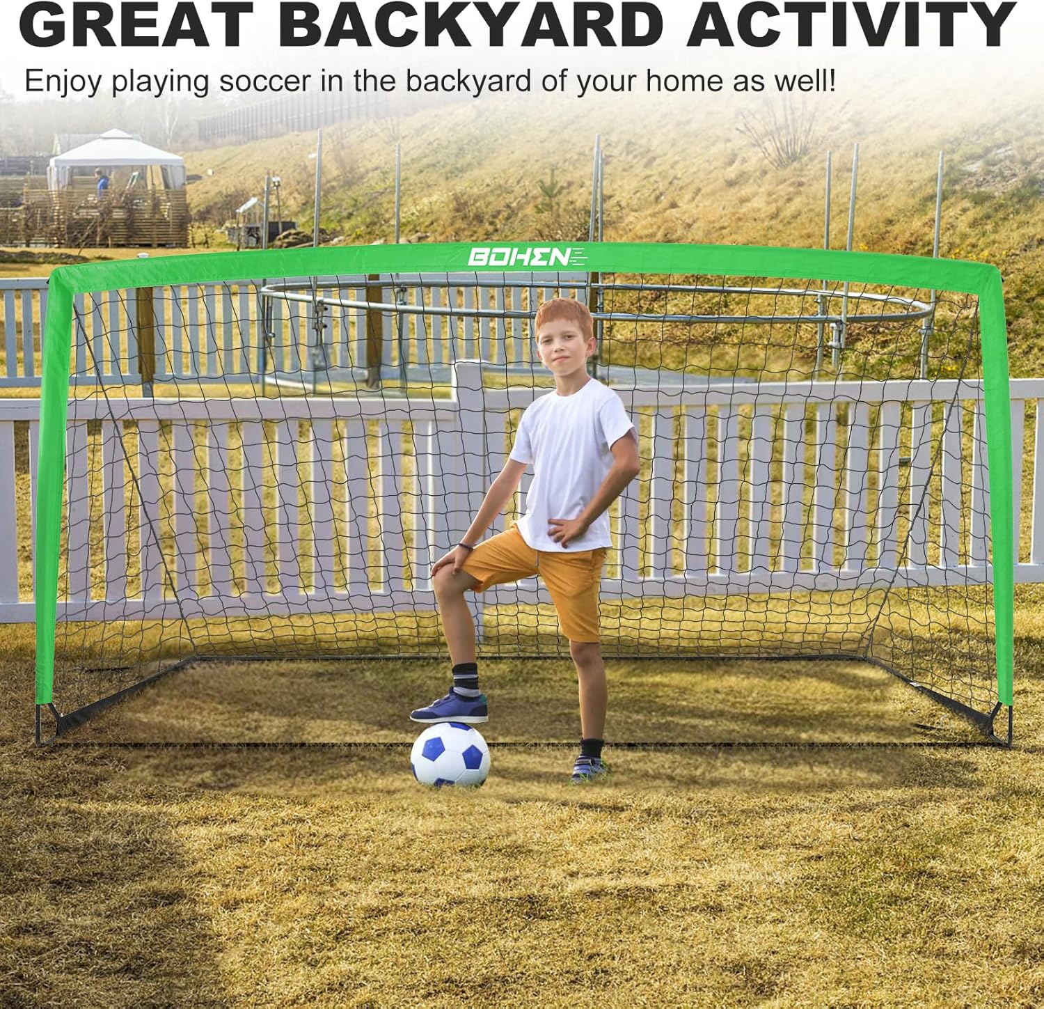 Description:BOHEN Metal Portable Soccer Goal – a powerhouse of durability and stability for an unparalleled soccer experience! Crafted with a solid metal frame, this goal stands as a symbol of strength and resilience. The robust iron pipes ensure a steadfast structure, capable of withstanding powerful kicks and providing a reliable soccer experience for both kids and adults. Its unwavering stability makes it a permanent fixture in your backyard soccer haven.The metal frame design simplifies setup and dismantling, making it a breeze to focus on the game without unnecessary complications. Upgraded with an 18-strand PE net, the Iron Frame Soccer Goal guarantees resilience against the toughest plays, ensuring longevity and consistent performance. Let the raw power of iron redefine your soccer experience – embrace the strength, elevate your play, and score goals with confidence!
