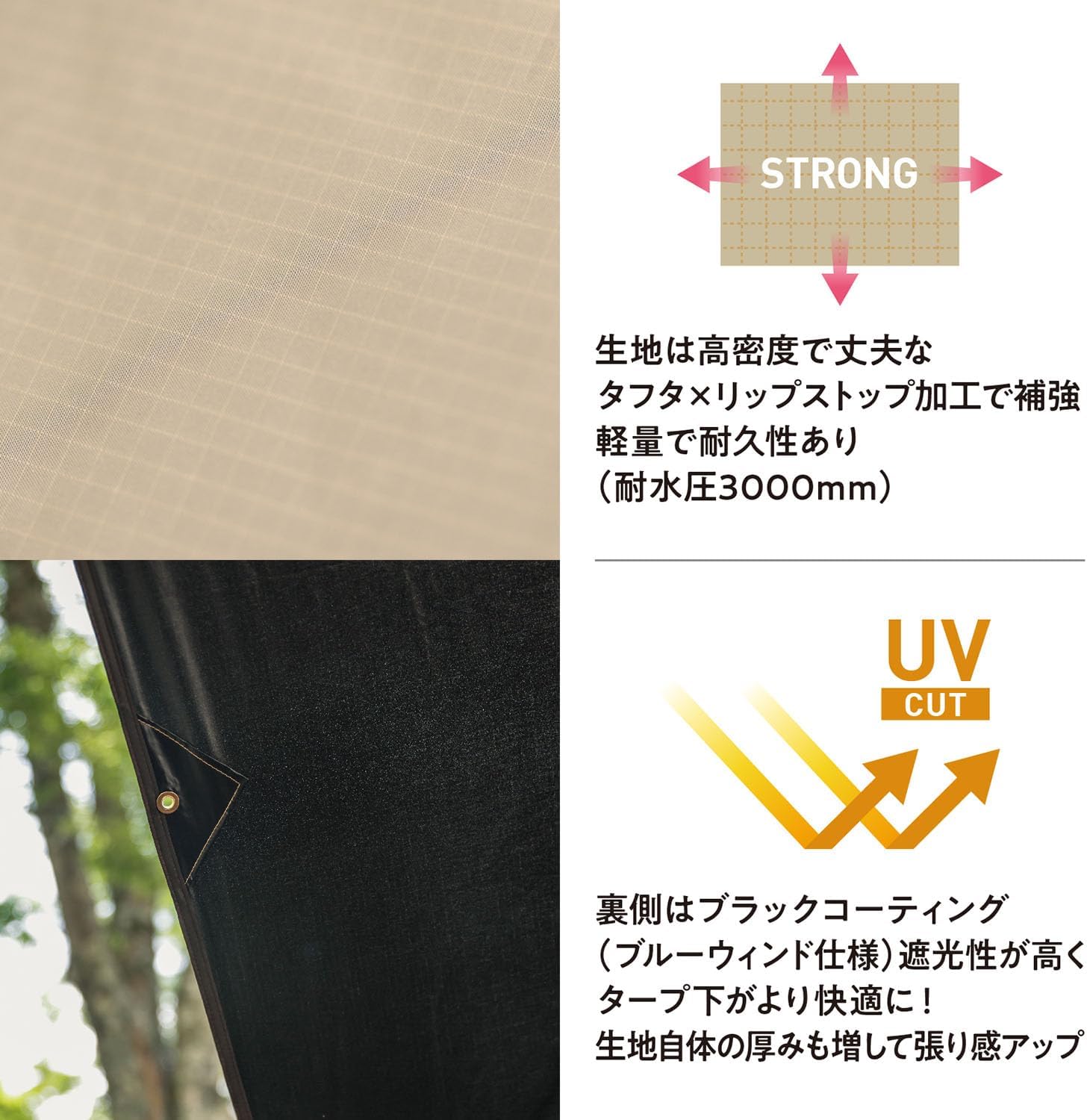 (Refreshing Space) BW (Blue Wind) Tarp. Lightweight and durable! Basic rectangular tarp with excellent light shielding properties. The pole and guide rope can be set in various places, so you can have a variety of camping activities. BW tarp can be selected from 3 types 2/3/4. 2 for solo, 3 for solo, 4 for pair groups ■ Ultra Light: Weight 0.9 kg Made of high-density and durable taffeta woven fabric that is lightweight, durable, and compact for storage. In addition, it is reinforced with ripstop processing for added durability. ■ Water Pressure Resistance: 11.8 inches (3,000 ■ BW (Blue Wind Specifications): The black coating is applied to the back of the fabric to provide high light shielding performance. More comfortable under tarp In addition, the thickness of the fabric itself is increased to provide better tension. ■ Lightweight type reduces the load on the poles for a more stable setup ■ Nearly square type 11.8 x 11.4 inches (300 x 295 A balanced tarp size and storage capacity. Great for multiple purposes from camping to touring, hiking, and solo use. General polyester tarp is easy to hold heat, especially in summer, the tarp itself may be very hot. This "Blue Wind" tarp has excellent blackout and thermal insulation, and the back side (under the tarp) is comfortable even when the surface is hot. In cold seasons, it is a function to relieve cold air, so it can be used all year round. (*There may be individual differences in the experience depending on the location of use and weather.) ■The black coating may have small dots in each location or the sewing area may be noticed depending on the situation, but these are not defective in the product specifications. The light blocking performance is not affected by the standard.