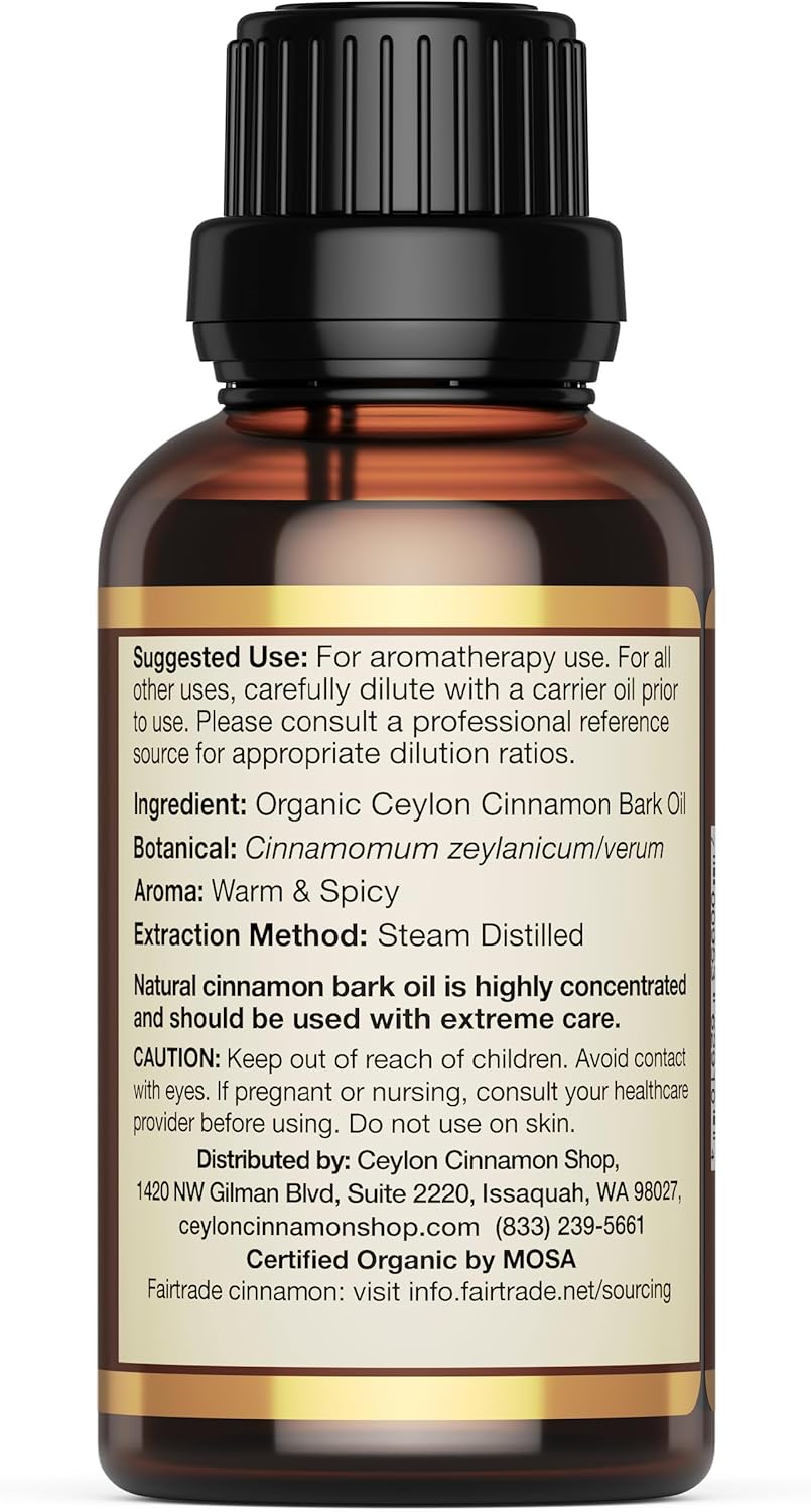 100% pure organic Ceylon cinnamon bark oil extracted through a natural distillation process. Cinnamon bark essential oil is highly concentrated and should be used with care.