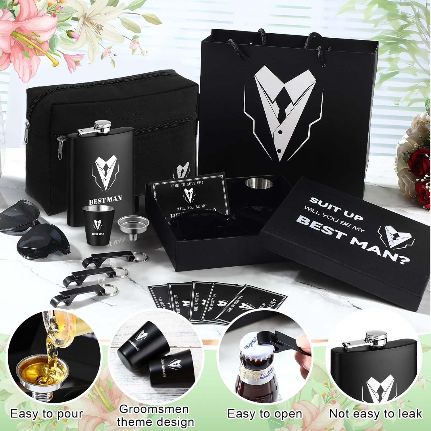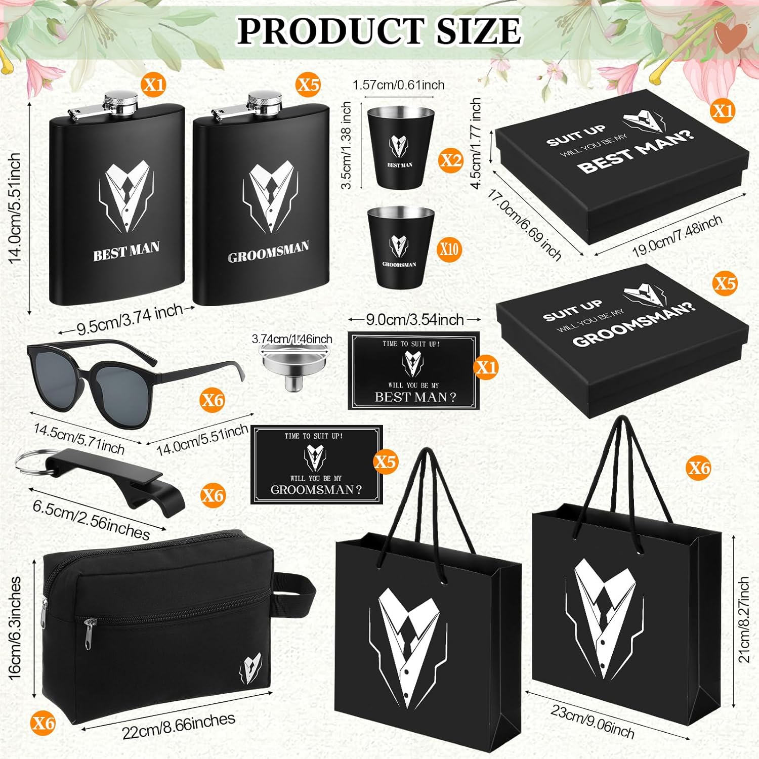 Chengu 60 PCS groomsmen gifts set groomsmen proposal gift set of 6 groomsmen box with 6 flask 6 funnel 6 gift box 6 toiletry bags 6 gift bags 6 sunglasses 12 cups 6 card 6 openers for wedding party Feature: Practical gift set: This groomsmen gift set is each item that combines elegance with practicality, you can give them to the bestmen, fathers of the bride, groom, or men attending your wedding or engagement to show your appreciation and care for them. Classic elegant style: These groomsmen gifts take black as the main color, classic and elegant, every gift set comes neatly packed, and ready to be gifted, and the paper bag with handle adds elegance and surprise and leaves unforgettable memories. Specifications: Material: Oxford cloth, plastic, stainless steel, paper Color: black Size: Cups: about 0.61 x 1.38 inches/1.57 x 3.5 cm Gift bags: about 9.1 x 8.3 x 2.8 inches/23 x 21 x 7 cm Gift boxes: about 8.7 x 8.3 x 7.9 x 2.6 inches/22 x 20 x 6.5cm Toiletry bags: about 8.66 x 6.3 inches/22 x 16 cm Flasks: about 3.74 x 5.51 inches/9.5 x 14 cm, 8oz Cards: about 3.54 x 2.13 inches/9 x 5.4cm Sunglasses: about 15.71 x 5.51inches/14.5 x 14 cm Openers: about 2.48 inches/6.3 cm Package includes: 6 x Gift bags, 6 x Gift boxes, 6 x Toiletry bags 12 x Cups, 6 x Flasks, 6 x Sunglasses 6 x Openers, 6 x Gift cards, 6 Funnels Warm notes: Please allow slight errors in size due to manual measurement. Due to different angles of light and shadow effects, please allow a little color difference with the pattern.