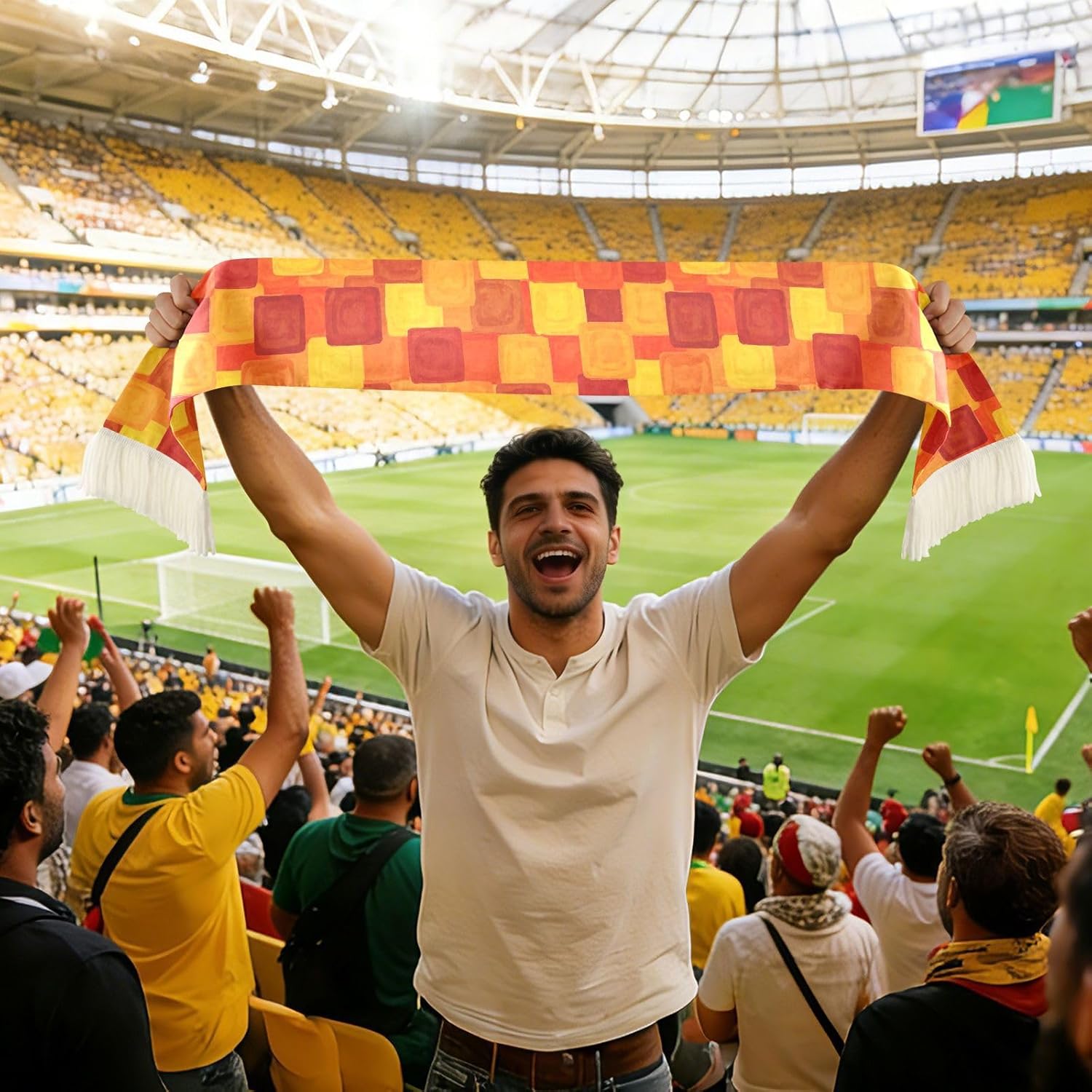 Show your team spirit in style and comfort with this versatile sports fan scarf. Made from 100% quick-dry polyester, this accessory is more than just a statement piece.Soft fabric provides a gentle touch against your skin, while its absorbency makes it practical for wiping away sweat on hot game days. No more fussing with ordinary towels.The vivid printed slogans stay bright and clear wash after wash, allowing you to proudly cheer for your team every time. With fringe detailing on both ends, it adds a classic fan accessory look.Ideal for soccer matches, sports events, or any gathering with fellow supporters. It also makes a thoughtful gift for passionate fans celebrating team loyalty.Handle with care: Wash separately in cool water (under 40°C). Do not bleach. Tumble dry low or line dry.
