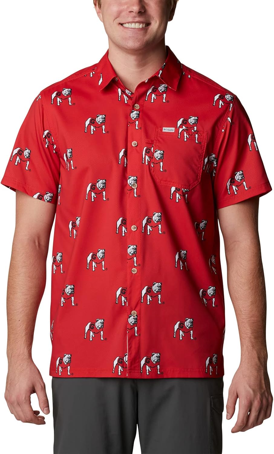 Ideal for summer, this short-sleeve has it all: a whimsical tropical pattern, built-in sun protection, sunglass-cleaning patch, and school spirit. This summer shirt delivers great moisture-wicking, fast-drying, UV blocking performance with an all-day UPF 40 rating. A mesh-lined vented back adds breezy comfort. Columbia offers this men’s short-sleeved shirt in multiple patterns and sizes. Available in extended sizing. Regular Fit. To ensure the size you choose is right, utilize our sizing chart and the following measurement instructions: For the sleeves, start at the center back of your neck and measure across the shoulder and down to the sleeve. If you come up with a partial number, round up to the next even number. For the chest, measure at the fullest part of the chest, under the armpits, and over the shoulder blades, keeping the tape measure firm and level. .