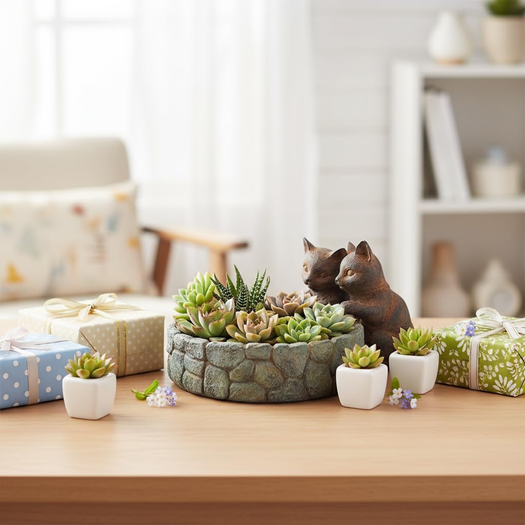 • 【Whimsical Cat Theme Design】 Bring a touch of playful charm to your greenery with this two cats succulent planter. Featuring two adorable felines curiously peering into a rustic stone-textured basin, it creates a heartwarming focal point for any cat lover's home.