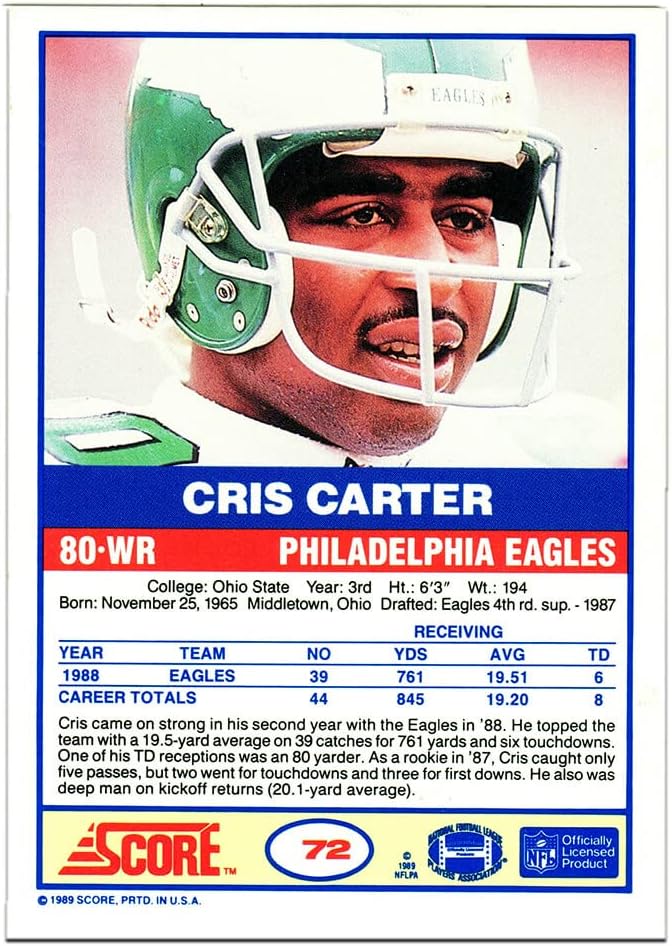 Cris Carter signed Eagles 1989 Score football rookie trading card #72. Item comes with a Schwartz Sports Memorabilia tamper-proof numbered hologram (on back of physical card) and Certificate of Authenticity which can be verified online.