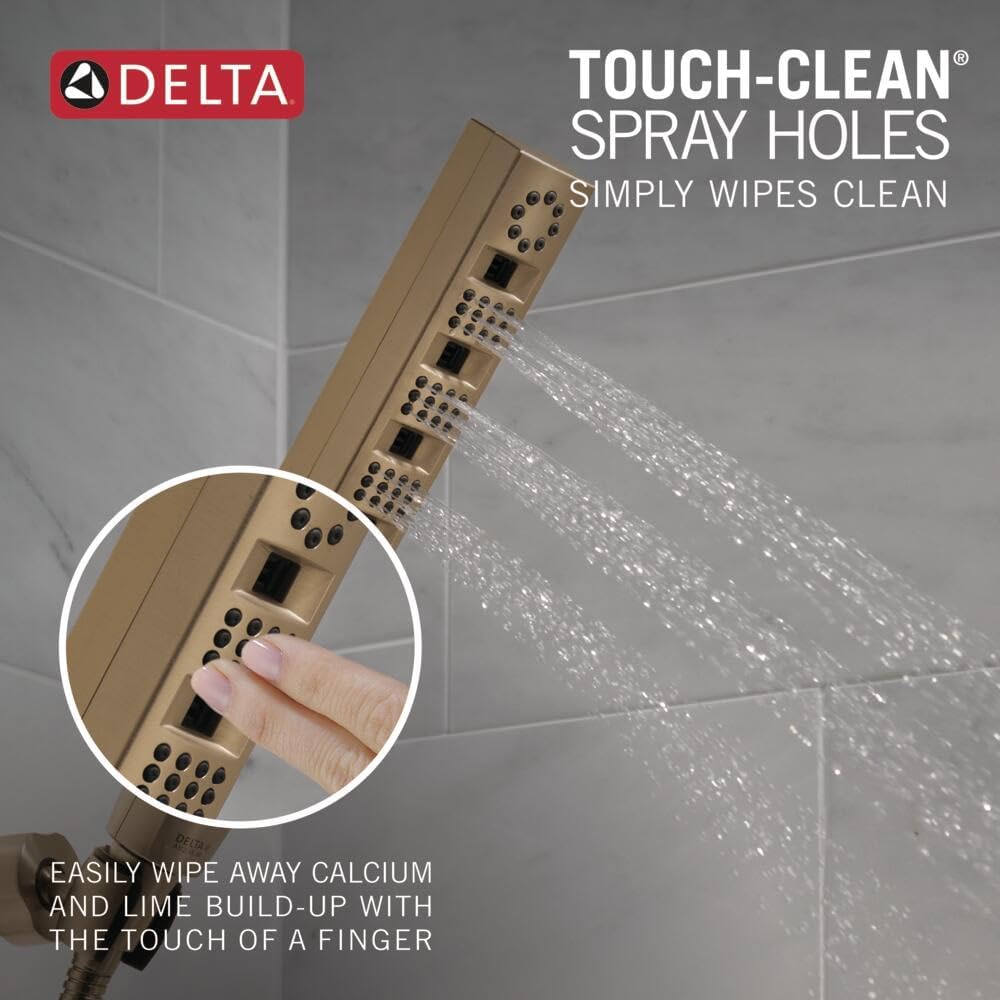 Experience a better shower with the control and flexibility of a Delta® hand shower. Great for showering yourself or your loved ones and pets, as well as for keeping your shower and tub clean. Delta® H2Okinetic® Showers look different because they are different. Using advanced technology, H2Okinetic showers sculpt water into a unique wave pattern, giving you 3X the coverage of a standard shower head and the feeling of more water without using more water. The pause setting gives you ample space for shaving, lathering and other shower tasks, then easily restarts the water with the temperature where you left off. This spray setting helps you conserve water, so you can worry less about depleting your supply of hot water - and you help the environment too. Delta® Lumicoat™ Finishes are guaranteed to resist water spots and mineral buildup and easily wipe clean without the need for cleaners or chemicals. The ultra-sleek surface repels liquids, resisting water spots and staying cleaner longer, so your faucet’s most commonly touched areas stay beautiful. While other products may gather unsightly mineral build-up over time, Delta soft rubber Touch-Clean® spray holes allow any mineral residue to simply be wiped away for an instantly refreshed look – with no need for soaking or the aid of chemical cleaners. You can install with confidence, knowing that Delta faucets are backed by our Lifetime Limited Warranty.