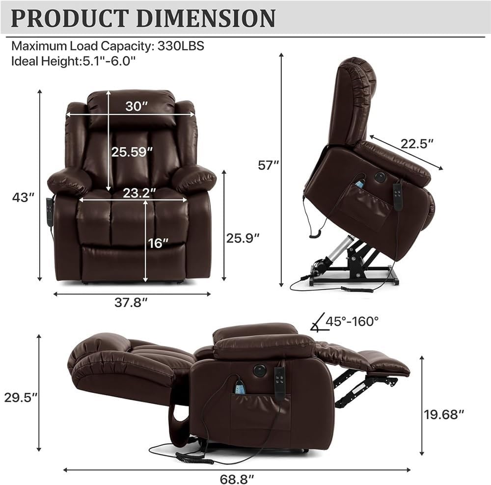 Convenient Side Storage Pockets and USB PortHeated Massage with Remote ControlDouble Lumbar and Footrest SupportDual Motor Power Lift Design