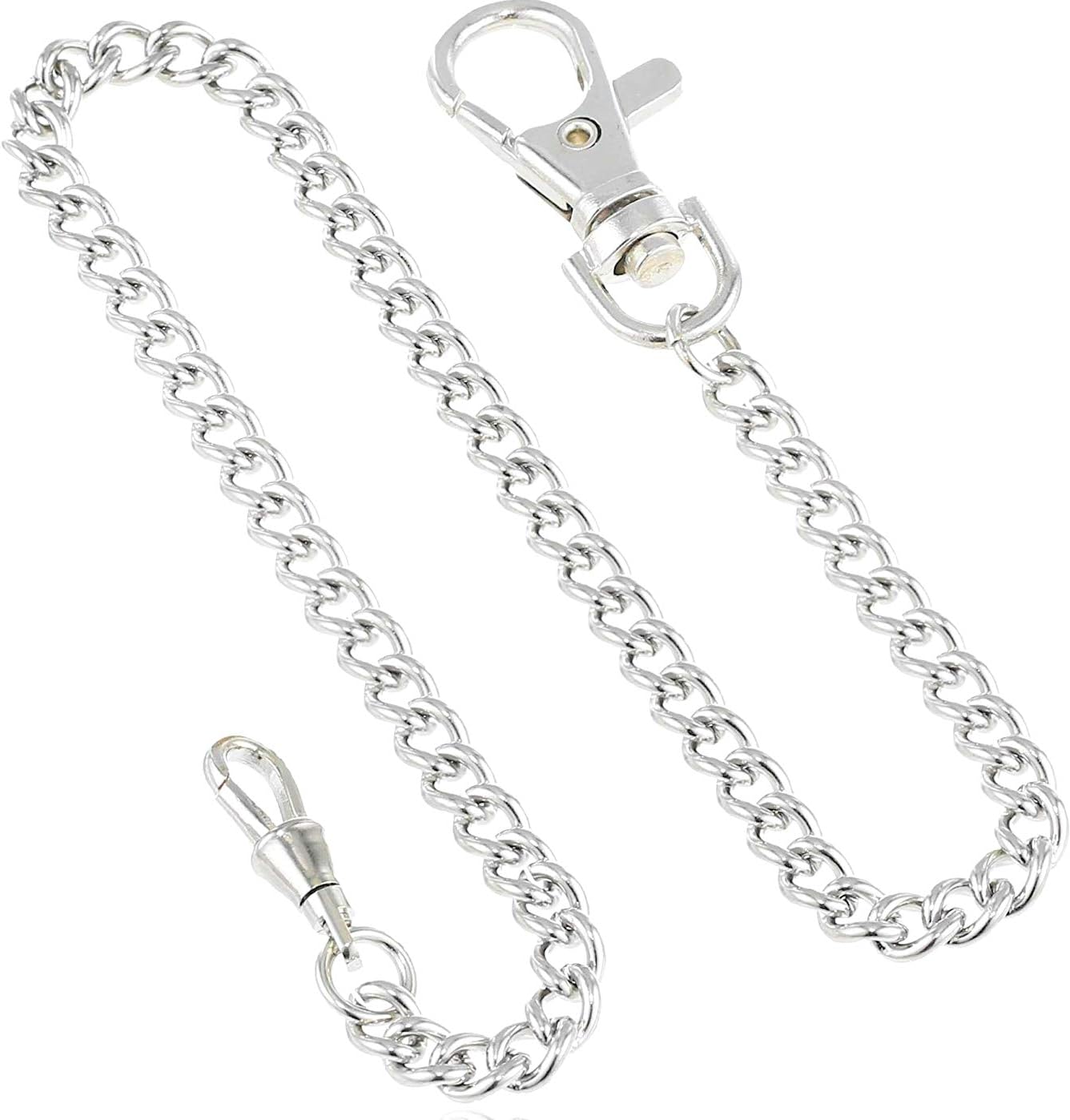 The Dueber name dates back to 1864 when John C Dueber began making watch cases. In 1886 John Dueber purchased a controlling interest in the Hampden Watch Company of Springfield, Massachusetts. The Dueber Hampden Watch Company was at the forefront of innovations in the American watch manufacturing industry. They introduced the first watch movement to the market with 23 jewels. Today, Dueber Watch Company is an American owned brand featuring high-quality pocket watches. Total Length = 14 inches Style = 6 mm Curb 39 mm Heavy Duty Lobster Claw Attachment This chrome plated steel pocket watch chain features a heavy duty lobster claw attachment on one end and a watch swivel clip on the other. This chain has a total length of about 14 inches from the end of the lobster claw to the end of the watch swivel clip. This is a high quality great looking chain to securely carry your prized pocket watch.