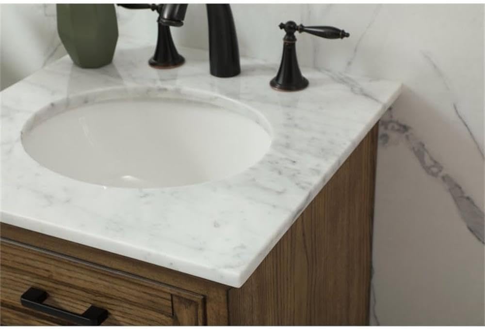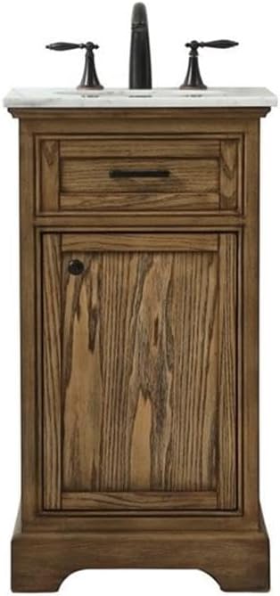 Clean lines and classic form can truly add a fresh look to your bathroom or powder room. This vanity, complemented by round hardware, will surely charm you with its confident style and subtle charisma. This vanity can store all of your bathroom toiletries, from extra towels to make up essentials. The vanity is crowned with carrara white marble and includes a porcelain undermount sink--adding both function and form that will truly amaze.Features:- Materials: Aluminum alloy, solid wood and MDF- Finish: Driftwood- Comes with an undermount porcelain sink and a carrara white marble countertop- Countertops are predrilled with 3 holes to accommodate a variety of faucets ( faucets are not included)- Constructed with one faux drawer- Designed with soft closing door- Built with a removable shelf, perfect to store your bathroom essentials- Rectangle shapeSpecifications:- Product Dimensions: 35"H x 19"W x 19"D- Product Weight: 65 lbs- Warranty: 1 year limited- Product Dimensions: (Countertop) 19"L x 19"W x 0.75"H- Product Weight: (Countertop) 18 lbs- Product Dimensions: (Sink) 7"H x 12.4"W x 10.39"D- Product Weight: (Sink) 6.6 lbs- Product Dimensions: (Sink Drain hole) 1.75"- Product Dimensions: (Faucet hole) 1.42"- Shelf Dimensions: 13.9"W x 13.5"D- Product Dimensions: (Shelf thickness) 11"- Weight Capacity: (Shelf) 20 lbs- Number of Doors: 1- Product Dimensions: (Door Handle) 0.94"H x 1.1"W x 1.1"L- Product Dimensions: (Cabinet interior) 19.74"H x 13.9"W x 13.5"D- Leg Dimensions: 4.45"H x 3.5"W x 3.5"D