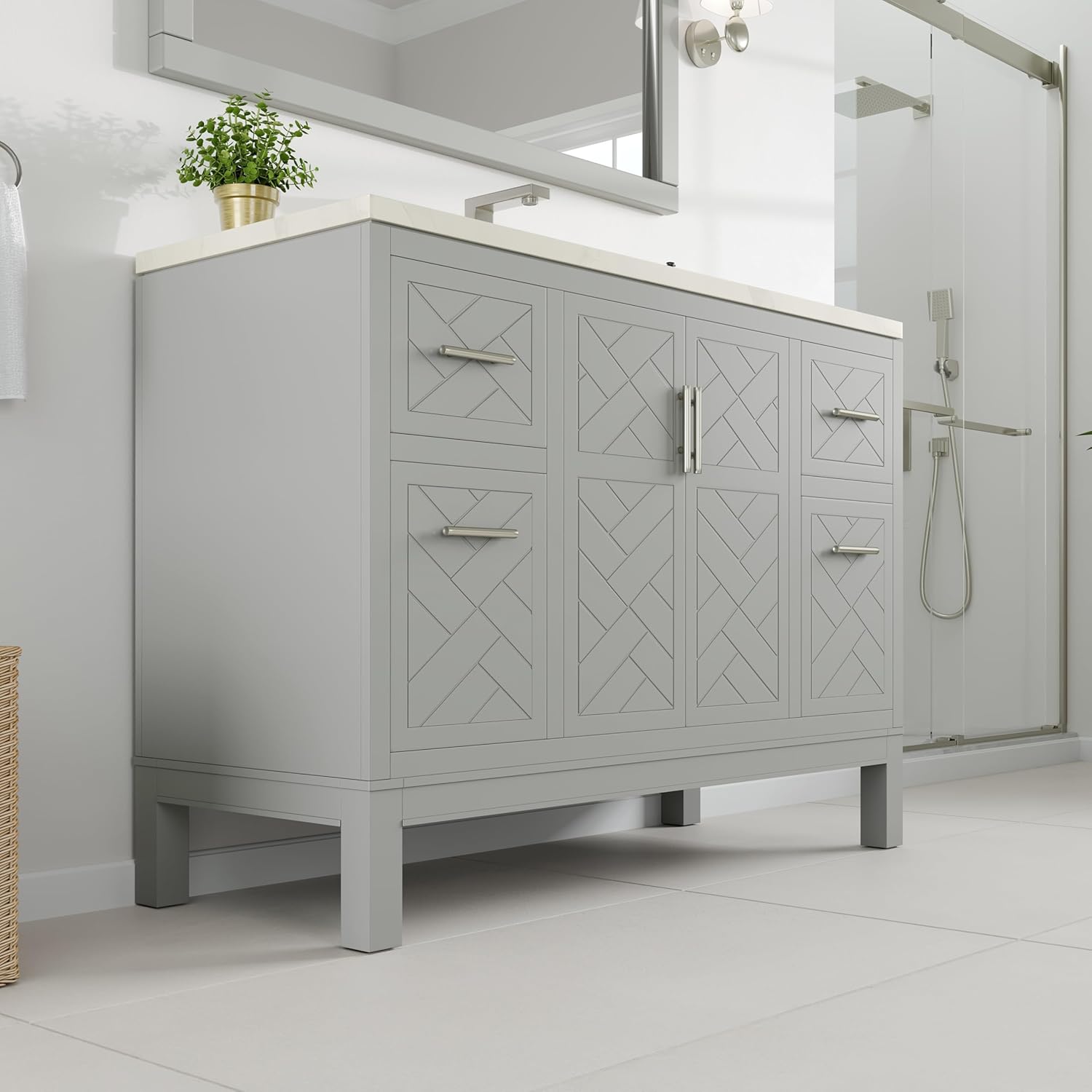 Elevate your bathroom with the Eviva Cambridge, a beautifully crafted freestanding vanity that blends timeless design with modern functionality. Constructed from solid wood, it features a luxurious Bianco Bella Quartz countertop that is stain-resistant and maintenance-free. The undermount white porcelain sink with overflow ensures durability and elegance, while brushed nickel handles add a sophisticated touch. Designed for convenience, the pre-drilled 8" widespread faucet mount allows for easy installation (faucet not included). Soft-closing doors and a fully extending drawers prevent slamming, while the open-back design ensures hassle-free plumbing access. The Eviva Cambridge arrives fully assembled for a seamless upgrade to your space (minmal legs assembly required).