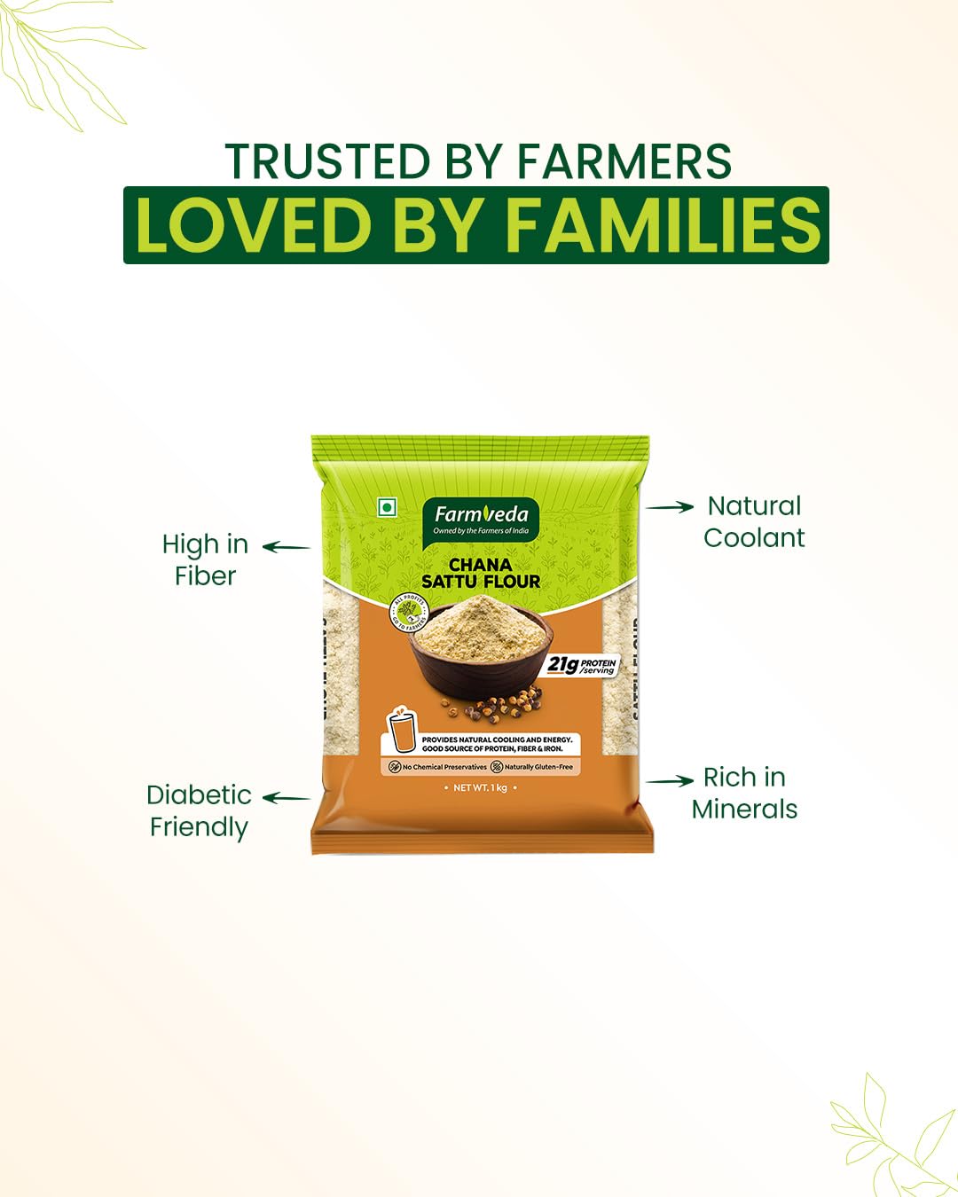 Farm Veda Channa Sattu Flour is made from premium roasted chickpeas to deliver natural nutrition and authentic taste. Rich in protein and naturally gluten-free, it is a wholesome choice for daily energy and strength. Free from additives and preservatives, this versatile flour can be used to prepare refreshing sattu drinks, traditional recipes, and healthy meals. A convenient and nutritious addition to your diet, it supports balanced nutrition and sustained vitality.