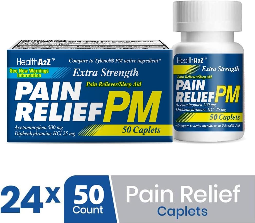 HealthA2Z Extra Strength Pain Relief PM caplets help temporarily relieve occasional aches and pains while supporting nighttime rest. Each value pack contains 24 boxes of 50 caplets each, totaling 1,200 caplets. This convenient bulk supply is ideal for homes, offices, healthcare facilities, and pharmacies.
