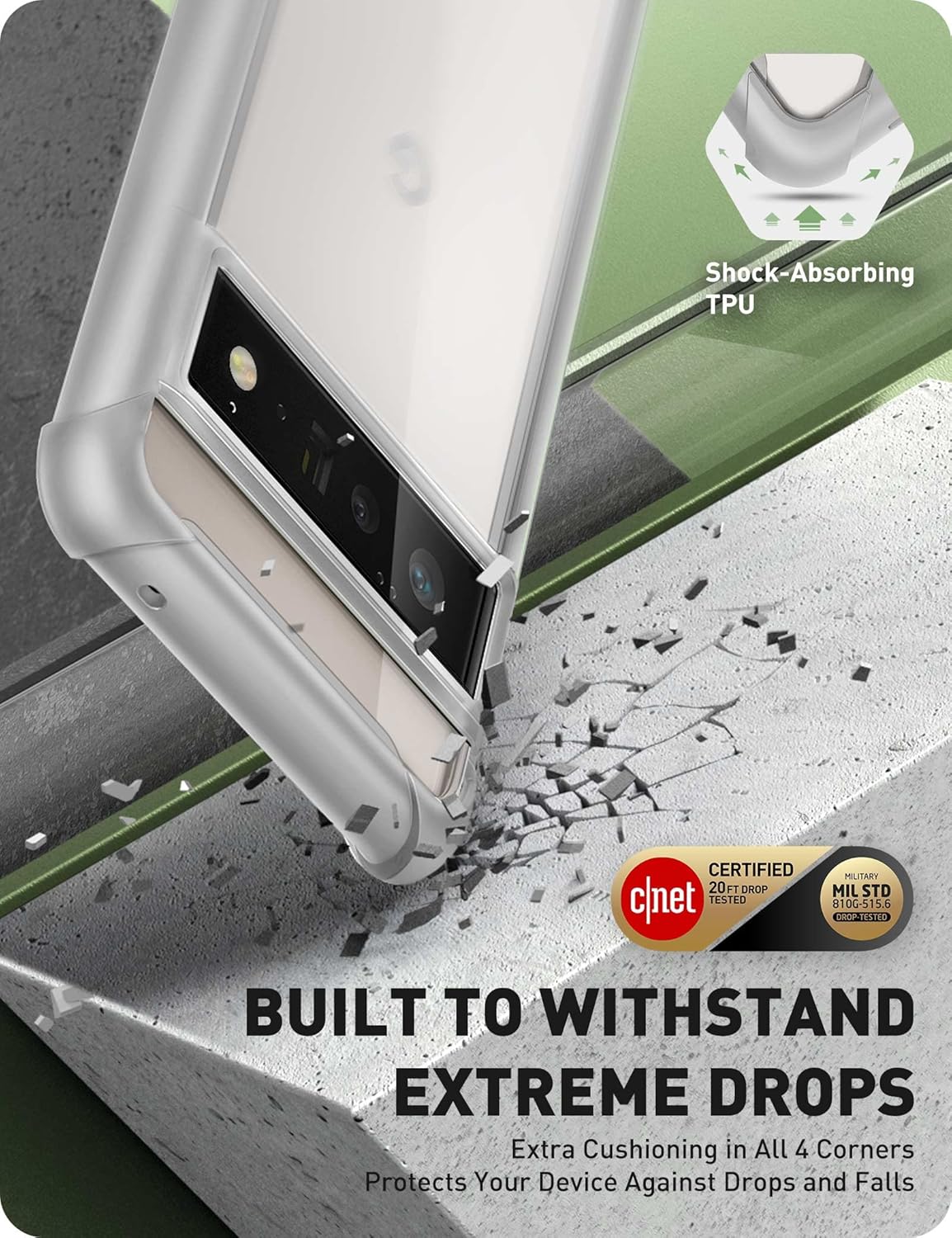 The i-Blason Ares Clear Protective Case is compatible with Google Pixel 6 Pro (2021) only. Built-in screen protector prevents scratches and cracks without compromising touch sensitivity. Raised camera and screen bezels provide added protection. Flexible TPU and polycarbonate materials provide 360°, CNET-certified protection from dust, dirt, drops, or falls (CNET certified and drop tested at 20 feet). Compatible with most wireless chargers.