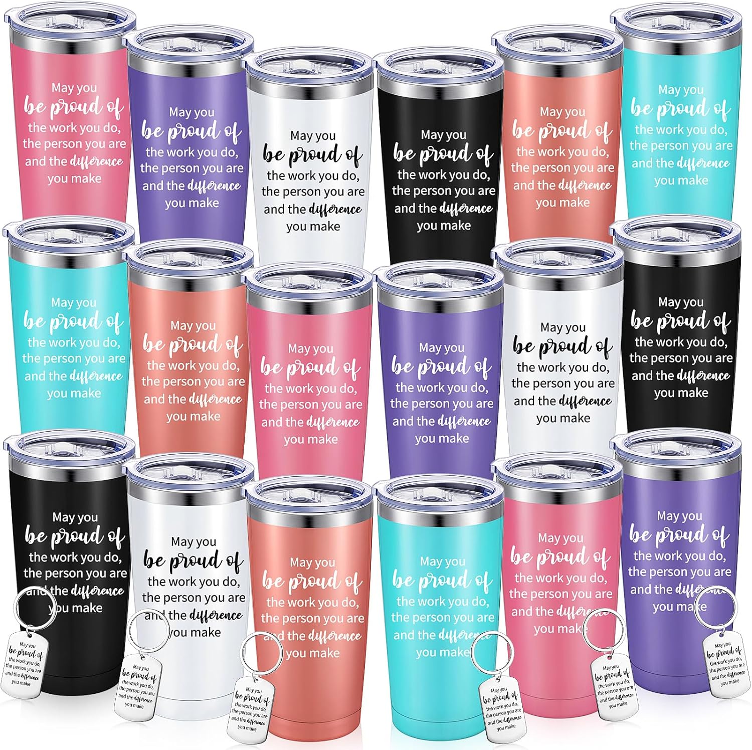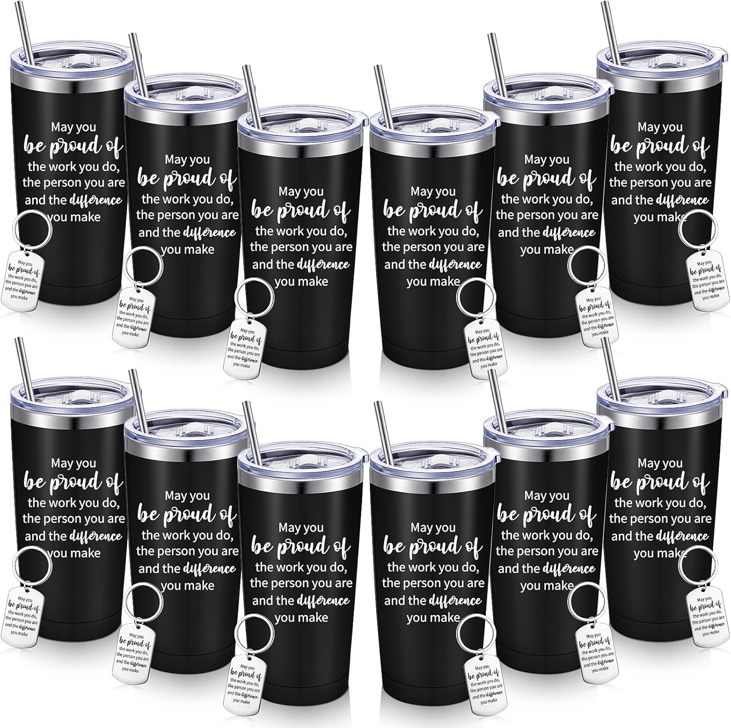 Elevate your gifting game with our 12-piece set of modern, inspirational tumblers, perfect for any occasion. Each 20 oz, stainless steel tumbler is insulated to keep your drinks cold for up to 9 hours or hot for 3 hours, featuring a glossy, cylindrical design with a distinctive, motivational slogan. The set includes a lid and straw for each tumbler, along with a matching keychain, all in vibrant colors like blue, red, black, rose gold, yellow, and orange. Ideal for birthdays, graduations, or simply saying 'thank you', these tumblers are reusable, dishwasher safe, and suitable for both hot and cold beverages. They're not just tumblers; they're a statement of appreciation and inspiration.