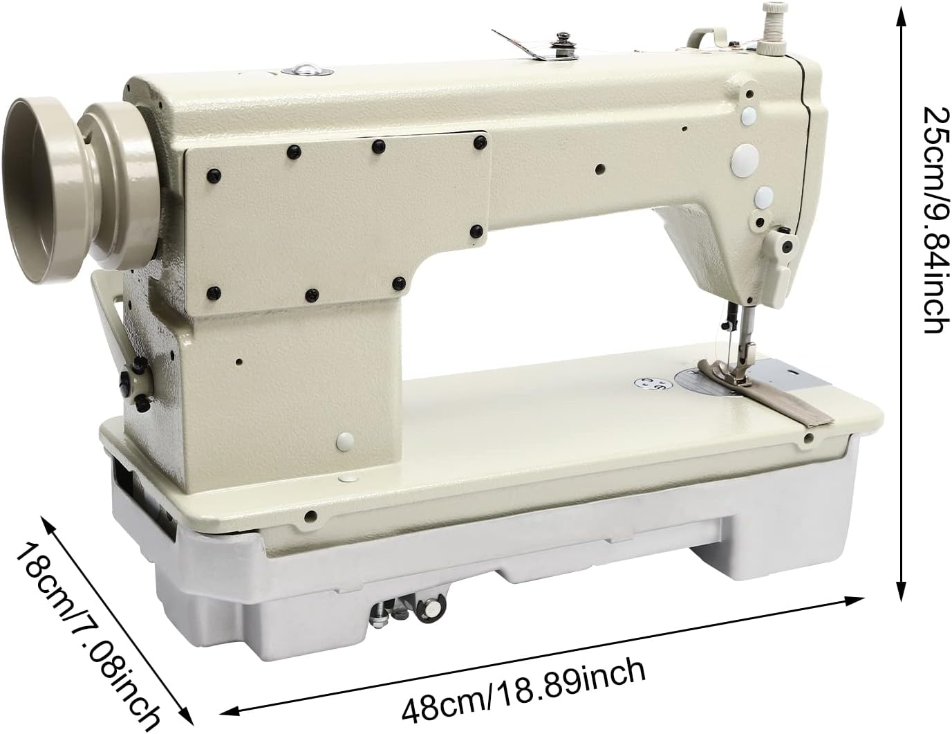 Other Features:【Thread Guide】It can be selected accordingly to the actual needs of sewing.【Adjusting Stitch Clamp】It allows you to adjust the tightness of the bottom thread. Turning clockwise makes the thread shorter and vice versa.【Oil Quantity Monitoring Port】It can be convenient for you to check whether the machine will supply oil when it is running.【Replaceable Presser Foot】It allows you to replace with a variety of functions presser foot(only one included) to achieve a variety of functions to meet your needs.【Small Attachment Mount Base】This design on the machine improves the operating performance when installing small attachments and the durability performance of the table.【Easy to clean】The surface of this product is smooth and flat, easy to clean. You just need to wipe it with a wet rag. 【Easy to Install】We are equipped with all the accessories needed for installation, so you can do the installation yourself!Specification:Color: WhiteMaterial: IronMachine Head: 6150Mounting Type: FreestandingProcess: High-temperature Spray PaintingPower Source: Fuel PoweredHeight of Wire Frame: About 55cm/21.65inSewing Line: 1 Kind (Straight Line)Maximum Sewing Length: 0.5cm/0.197inPackage Size: 25*55*65cm/9.84*21*25.59inchProduct Size: 48*18*25cm/18.89*7.08*9.84inchGross Weight: 34.5kg/76.06lbsNet Weight: 25.5kg/56.22lbsPackage Includes:1* Straight Stitch Sewing Machine1* English Operation ManualOther Accessories for AssemblyNotes:1.Please note that if parts are missing, it may cause personal injury, and we recommend wearing safety devices (not included) for operation. 2.It can be used with a clutch motor, a table and an energy-saving belt motor (not included).3.Please read the operating manual completely before use. And pay particular attention to the safety instructions included.