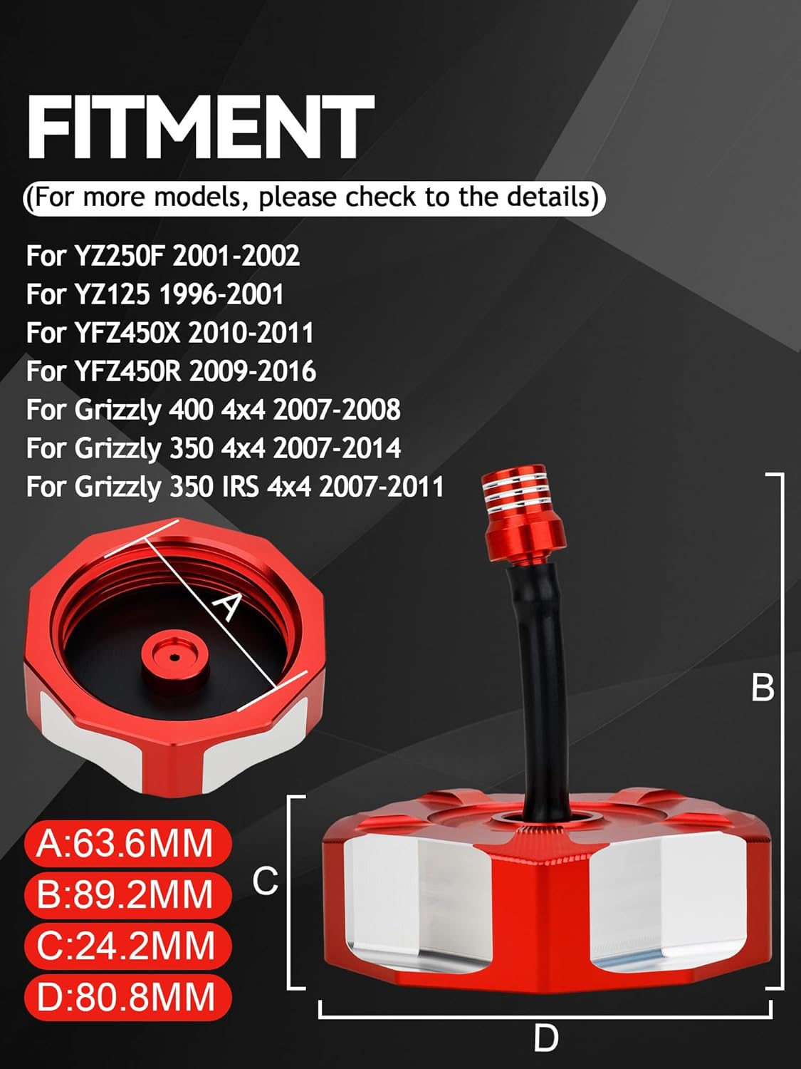 FITMENT: For DR-Z70 2008-2013 For RMZ250 2007-2009 For DRZ125 2003–2011 For DRZ400 2000–2004 For DRZ400E 2000–2007 For LT-R450 2006-2009 For LT-Z400 2003-2009 For LT-Z400Z 2003-2009 For LT-Z250 2004-2009 For WR125 2008-2012 For TC250 2009-2013 For TE250 2009-2013 For SM250R 2009 For Banshee 350 1987-2006 For Raptor 125, 250, 350, 660 - All years For Warrior - 1987-2004 For Blaster 200 1988-2006 For Wolverine 450 4x4 2008 For Wolverine 350 4x4 2002-2005 For Wolverine 350 2x4 2006-2008 For Kodiak 400 4x4 Auto 2003-2006 For Kodiak 400 4x2 Auto 2003-2004 For Grizzly 660 4x4 2002-2004 For Grizzly 450 4x4 2007-2014 For Grizzly 400 4x4 2007-2008 For Grizzly 350 4x4 2007-2014 For Grizzly 350 IRS 4x4 2007-2011 For Grizzly 300 2x4 2012-2013 For Bruin 350 4x4 2004-2006 For Bruin 350 2x4 2004-2006 For Bruin 250 2005-2006 For Big Bear 400 4x4 2001-2005 For Big Bear 400 4x4 IRS 2007-2012 For Big Bear 400 2x4 2001-2004 For Bear Tracker 2001-2004 For TTR250 2001-2006 For TTR225 2003 For YZ426F 2000-2002 For YZ400F 1998-1999 For YZ250F 2001-2002 For YZ250 1996-2001 For YZ125 1996-2001 For YFZ450X 2010-2011 For YFZ450R 2009-2016 For YFZ 450 2012-2013 For YFZ 450 2004-2009 For Arctic Cat DVX400 2004-2008 FEATURES ATV gas cap made from lightweight aluminum with a smooth anodized finish, this gas cap brings a touch of polished style to your ride while standing up to the elements. The specialized sealing material in gas cap is assist its flexibility over time, working to contain and not easy to dry or crack. ATV gas cap have one-way vent, assist to have smooth operation and is designed to lessen the potential for spills during angled or rolled positions. PACKAGE INCLUDES: 1 * Tank cap as pictures. Instruction of installation is not included.