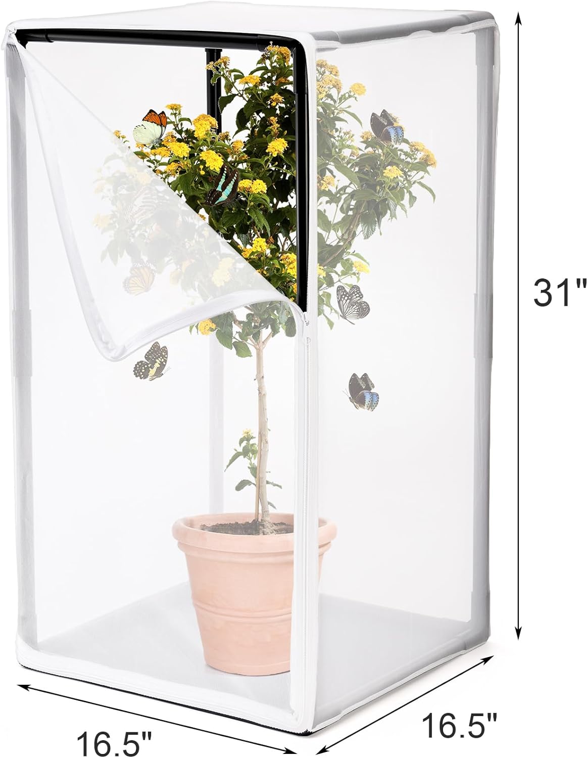 Kingrol monarch butterfly habitat with 4 mesh panels and a clear vinyl window panel creates an ideal environment for your caterpillars to grow into monarchs, black swallowtails, or painted lady butterflies. This butterfly habitat boasts a sturdy plastic frame with a polyester net cover, so rest assured that predators won't attack your baby butterflies. Large zippered open door for easily inserting insects, leaves, water, and food. The insect enclosure is an excellent gift for children, family members, or friends who are nature enthusiasts, providing a fun and educational experience. Specifications ▪ Material: Polyester, Plastic ▪ Color: White ▪ Dimensions: 16.5" x 16.5" x 31" (LxWxH) ▪ Package Contents: 1 Butterfly Habitat Cage Features ▪ Large zipper side opening for easy feeding and releasing of butterflies ▪ Five mesh panels for optimal airflow ▪ Clear vinyl window panel for easy observation of caterpillar transformation Steps: 1. Assemble the plastic frame by referring to the parts drawing in the kit. 2. Measure the frame to confirm it fits within the dimensions of 16.5"x 16.5"x 30.3". 3. If the frame is too large, use body strength to compress the tubes. 4. Install the mesh: Fit one end of the net cover first, then the other end, alternating sides evenly to stretch the net cover.
