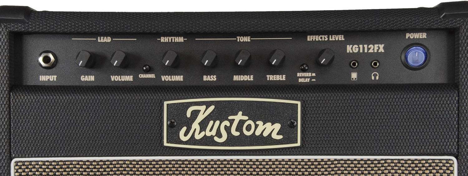 The Kustom KG112FX is a 20-watt guitar combo amplifier with a 12-inch Kustom speaker, two channels and Reverb and Delay effects. It is designed to offer a wide range of tones, both clean and dirty, while providing rugged dependability and intuitive operation. The Rhythm channel offers clear, dynamic tones that are perfect for a wide variety of musical styles. Using the Gain control, the Lead channel can dish out anything from chunky Classic Rock sounds to the heaviest, modern Metal tones out there. Separate Bass, Mid and Treble controls let players fine-tune the amp's tonal response as required.