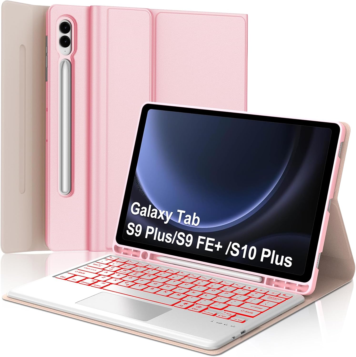 KVAGO Galaxy Tab S9 Plus Case with Keyboard 12.4 inch, 7 Colors Backlit, Detachable Folio Keyboard Cover with S Pen Holder, PinkProduct Advantage:Ultrathin design,Slim and lightweight tablet case provides excellent protection from bumps, scratches, and spills,Keeps your tablet nice and safe.Magnetically Detachable Bluetooth Keyboard:Samsung Galaxy Tab S9 Plus Keyboard Case includes a removable wireless keyboard with strong magnets for easy attachment or detachment. Multiple Viewing Angle: This case with keyboard is designed with three anti-slip grooves, allowing you to adjust the screen to the perfect viewing angle. Multi-operating systems: Works with iOS, Android, and Windows systems.System Switch Key Combination: Fn+Q (Android) / W (Windows) / E (iOS)The Samsung Galaxy Tab S9+ Keyboard Case can be used as a birthday, Christmas, Thanksgiving, Mother's Day, and Father's Day gift for family/friends, making it a surprising gift.Package List:1*Samsung Galaxy Tab S9 Plus Case1* Wireless Backlit Keyboard1* Charger Cable1* User Manual.