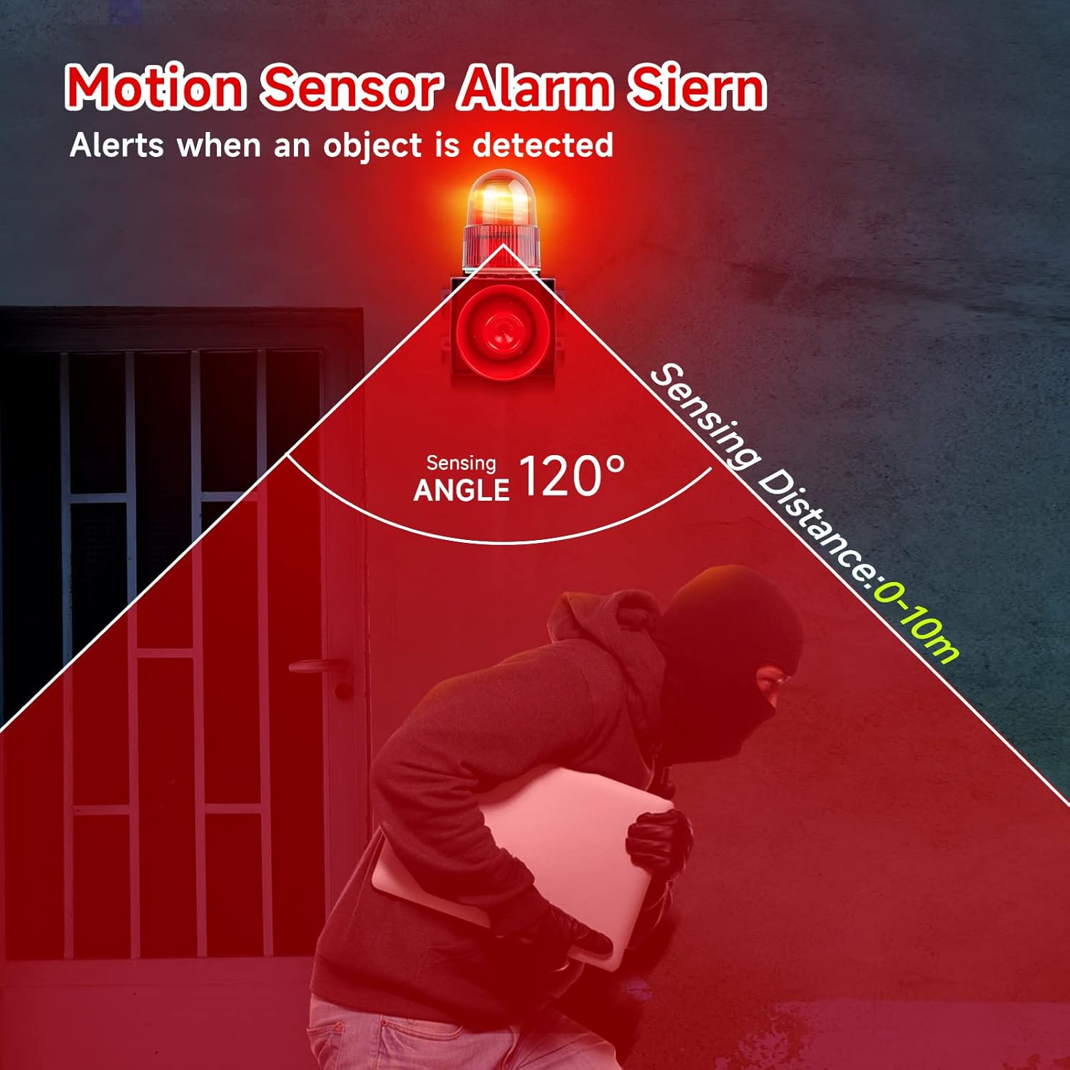 Product SpecificationProduct:Motion Activated Alarm SirenBrand:YASONG(Y DIANS S)Model:SLA-01WFactory:YASONG ALARMSize:306×150×174 (Unit: mm)Weight:3 KGMaterial:cold rolled steelVoltage:DC12V/24V;AC110V/220V...Power:25WIP rating:IP65Induction range: 1M≤distance≤10MInduction time: 2 seconds - 120 secondsTone:9(Switchable)Volume:0-120 dBLight way:LED StrobeShade color:R*Y*G*BWorking temperature: -40℃~70℃Installation method: wall mountNote:Wiring requiredInfrared detection can be installedCustomization: Contact us