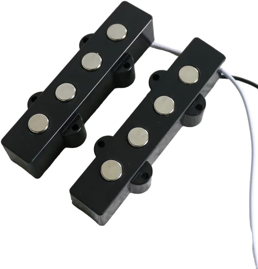 Myles Music 4 String Bass Flat Pole Pickups Set, Ceramic Magnets For Jazz Bass -Magnet: Ceramic magnet -Pole piece: 9mm large pole piece -Plastic bobbin -Cover: Plastic, black color -Specifications: Wide frequency range J bass sound Neck: 3.0K 2.8H Bridge: 3.2K 3.0H -With mounting screws and springs