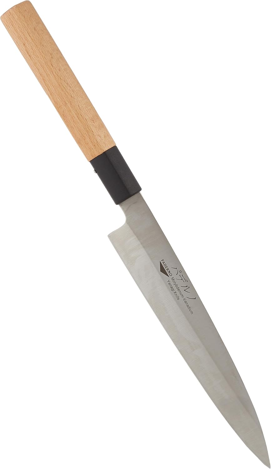 The Paderno World Cuisine 11 7/8" Yanagi Sashimi sushi knife is excellent for cutting raw fish. This suchi knife is typically a single grind, long, narrow blade similar to the Tako Sashimi knife. The blade is constructed of a special type of stainless steel for maximum edge retention. It has a razor-sharp edge, slip-resistant wooden handle and pointed tip. The thin, sharp edge makes for cleaner cuts through the soft flesh of fish. In order to avoid bruising or tearing delicate fish it is recommended to use a professional sushi knife. It should never be used to cut harder objects. It is recommended to hand wash and thoroughly dry these knives after use.