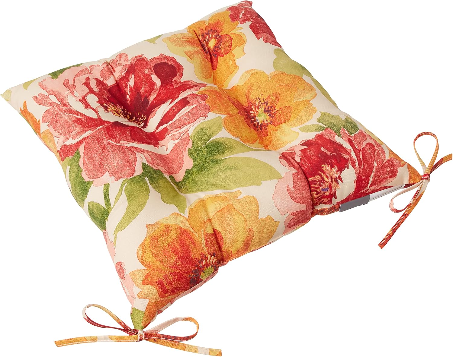 Add ambiance to your porch with the gorgeous flair of this set of two outdoor tufted chair cushions. Their watercolor pattern with large-scale, detailed flowers is in shades of red and orange on an off-white ground. Fabric is durable and fade resistant. Additional features of these outdoor tufted chair cushions include 14" ties and recycled polyester fiber fill with sewn seam closures. Also suitable for indoor use.