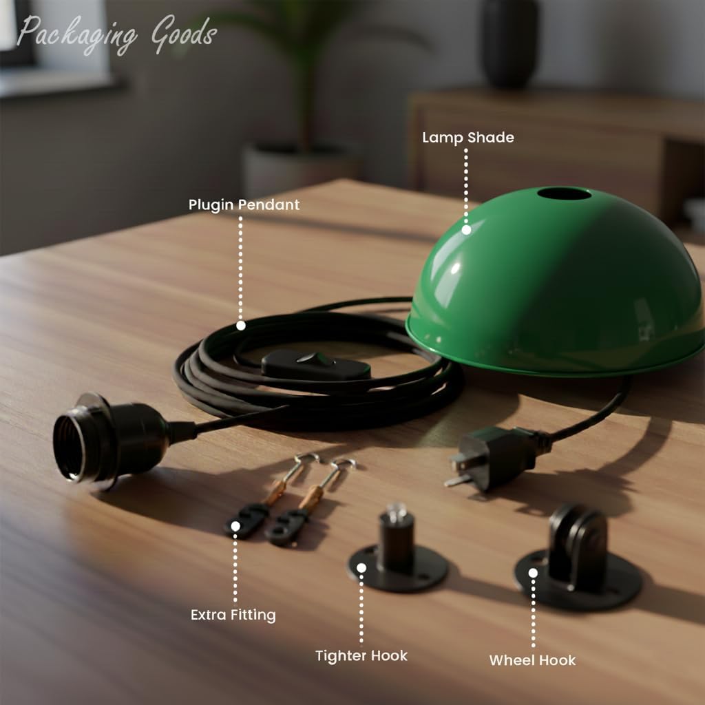 | Included Components | 1ร Metal Dome Shade, 1ร Metal Wheel Hook, 1ร Plug-in Cord with E26 (4m), 1ร Tighter Hook |