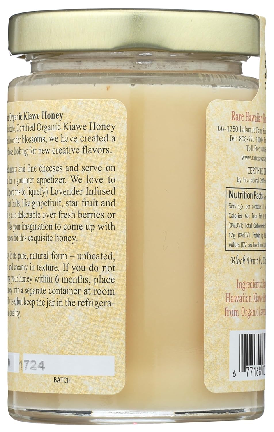By infusing our delicate, Certified Organic Kiawe Honey with organic dried lavender blossoms, we have created a true culinary treat. This is the only honey that we gently warm to infuse the lavender essential oil into the honey, but we do not warm enough to destroy beneficial enzymes or pollen, so the honey is still raw and recrystallizes into the creamy consistency that everyone expects from us. We do suggest that you gently warm portions of this honey that you want to drizzle over fresh berries, grapefruit, star fruit, dragon fruit or ice cream! Use it in its creamy state for spreading over cured meats and fine cheeses, or served on crackers or bread for a gourmet appetizer.