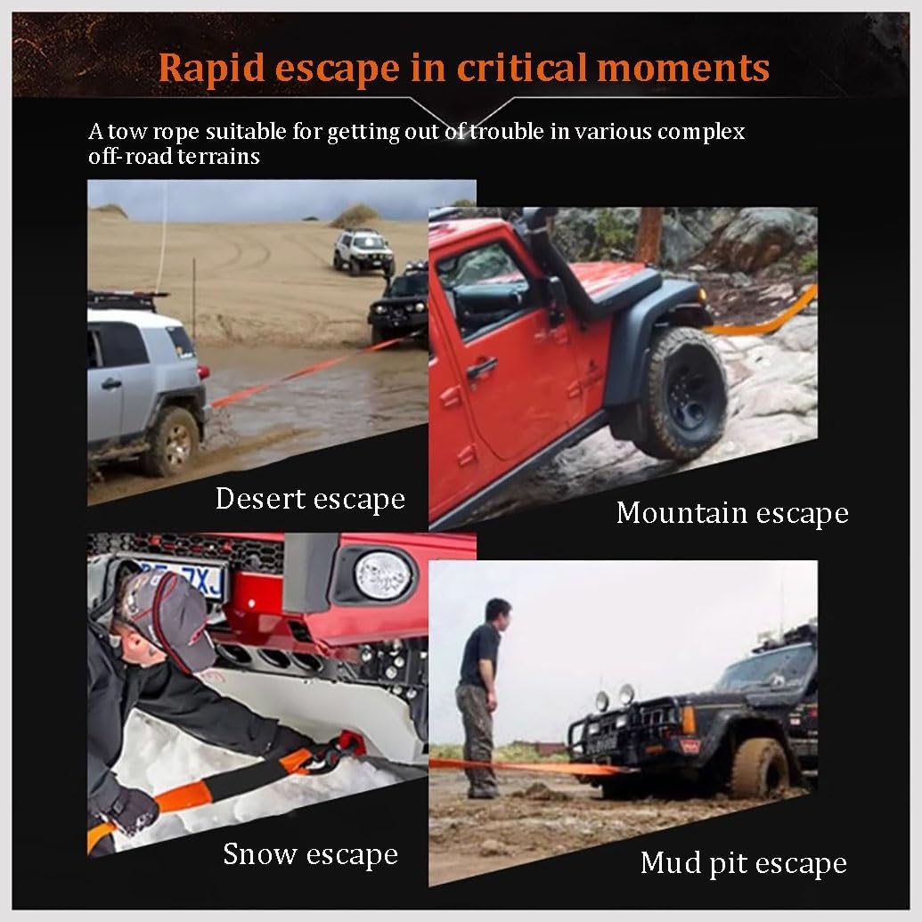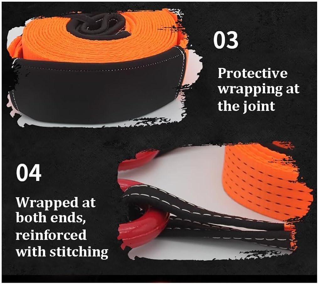 To handle these unexpected events economically and efficiently, you need a tow rope.Specification:Product Name: Reinforced Tow RopeMaterial: High-strength nylon + American-style hookColor: orange colorSizes: 3 meters 3 tons , 3 meters 8 tons , 3 meters 10 tons , 3 meters 15 tons , 3 meters 20 tons , 6 meters 3 tons , 6 meters 8 tons , 6 meters 10 tons , 6 meters 15 tons , 6 meters 20 tons , 9 meters 8 tons , 9 meters 10 tons , 9 meters 15 tons , 9 meters 20 tonsRope Breaking Strength:44100 lbsApplicable to: Small and medium-sized trucks and SUVPackage Included:Tow Rope x1Steel Buckle x2Storage Bag x1Notes:This product is measured manually and may have an error of 1-3cm.