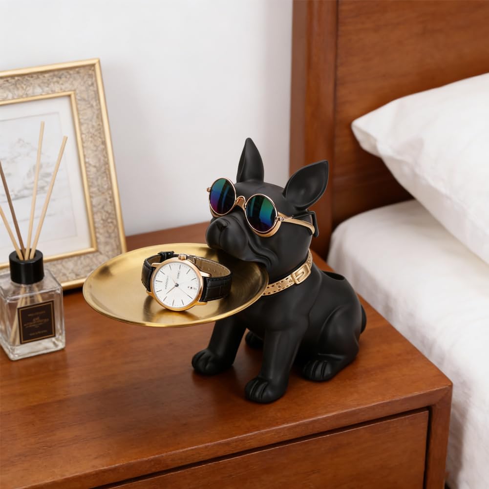 • Bulldog Animal Ornaments----Mini bulldog statue design, the bulldog statue steward wearing glasses holds a metal tray in his mouth, the shape is novel and interesting, adding a bit of fun to your home decoration. Bulldog jewelry is powerful, cute and practical. It can not only be used as sculpture jewelry, but also can store small items such as mobile phones, keys, coins, wallets, remote controls, fruits, candies, jewelry, etc., saving space.