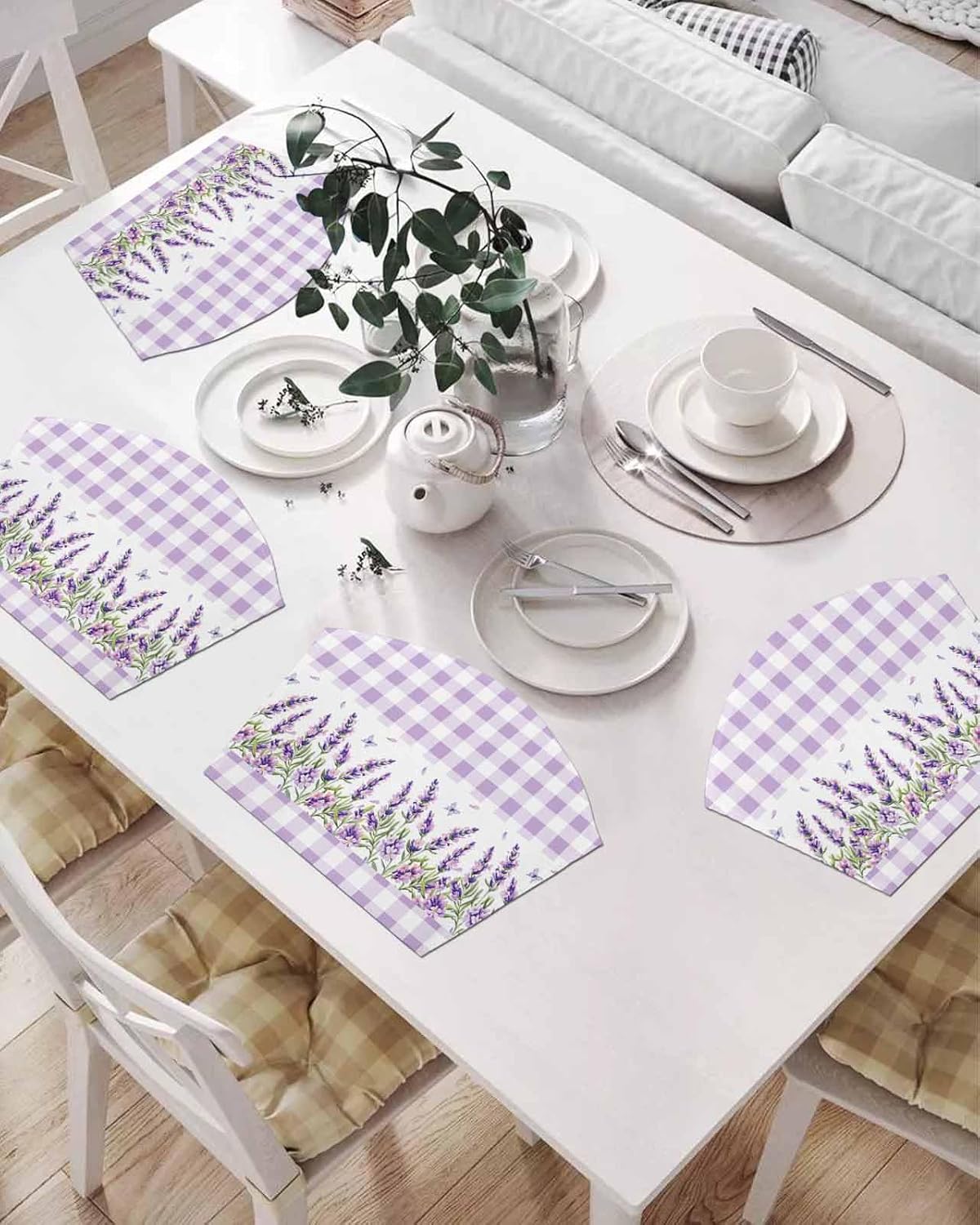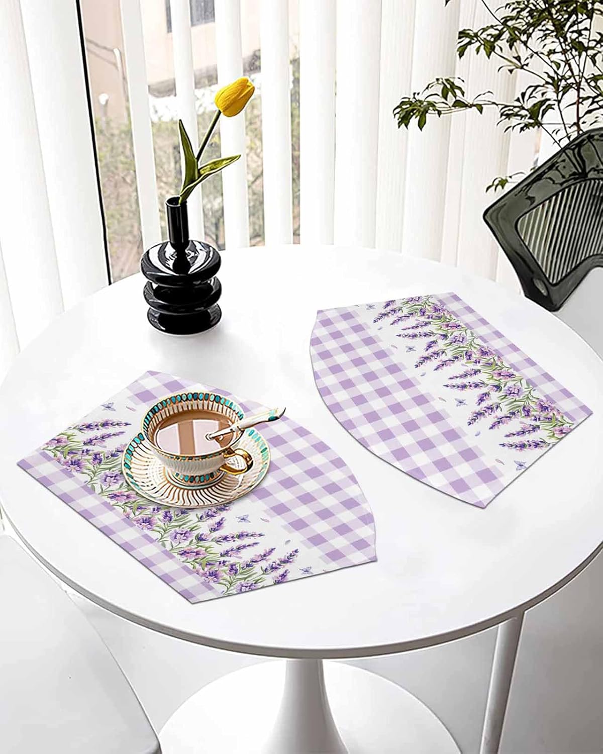 Round table placemats add charm and elegance to your table setting, while keeping your table clean and enjoy your meals with your loved ones.DetailMade of eco-friendly materials, non-slip table mats are breathable, colorfast, and safe to use on your dining table, protecting your table from spills and dirt.Wedge place mats have fine workmanship, dense overlocked stitches on edges; crisp and vibrant printed patterns; wedge-shaped design, providing a elegant addition to the table setting, bringing a different style experience to your kitchen.Function1. Placemats protects your table from scratches and spilled food residue, which makes it a great choice for families with children.2. Table mat insulates against burns and effectively protects the glass, wood, and marble table tops.While reducing noise from plates and flatware.3. Round table placemats is not only practical but also decorative. It easily decorates and renews your tables, instantly lights up the whole table, and makes life colorful. Delicious food with elegant placemats will whet the appetite and better experience the pleasure of the tongue.Usage RangeWedge shaped place mat can be as placemat, coaster, potholder, and potholder for dining tables.As a decorative piece for dining and tea tables, placemats can also be used to decorate various other furniture, such as dishes, cups, ashtray, etc.Fan shape wedge place mats is also the best gift option for your family on Mother's Day, Memorial Day, Independence Day, birthday, housewarming, and other events.Warm TipDon't worry about creases, just put heavy books on the mat to flatten them out.Please wipe off the water in time, because a large amount of liquid stays on the mat for a long time and may seep through the mat to the table below.Please understand that color of the placemats will be slightly different due to the difference in monitors and screens.