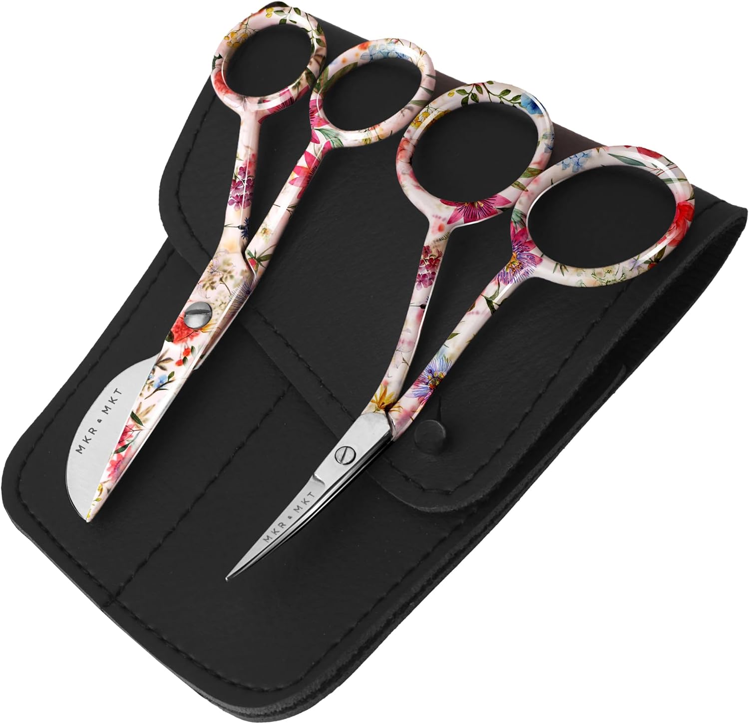 MAKER AND MARKET Small Embroidery 4.5 Inch Scissors Set of 2 Kit - Mini Double Bend Offset Duckbill and Double Bend Long Applique Needlepoint Blade with Pouch Sleeve (Satin)