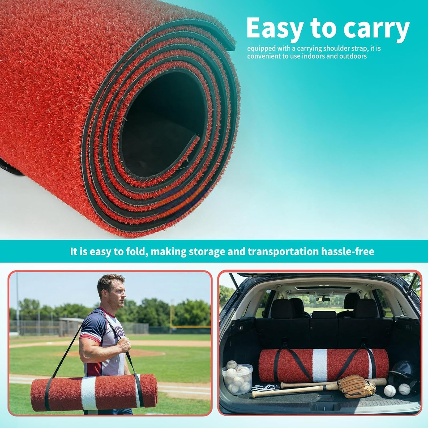 Softball and Baseball Pitching Mat 10 x 3 ft This 10 x 3 ft softball and baseball pitching mat is designed for fastpitch players seeking consistent mechanics, stable footing, and a realistic practice surface. It features a regulation 24 x 6 inch pitching rubber and a full stride line that help pitchers maintain correct alignment, accurate foot placement, and repeatable motion. Realistic and Durable Training Surface The mat uses 12 mm high-density pe turf with 65000 fibers per square meter, creating a realistic mound feel while preventing fading during outdoor practice. The surface provides dependable traction for both softball and baseball pitchers, making it a reliable year-round training accessory. Stable Anti-slip Backing A reinforced 5 mm eva anti-slip backing keeps the pitching mat stable on concrete, turf, hardwood, and gym floors. This reduces unwanted shifting and protects indoor flooring during high-intensity pitching drills. Upgraded Soft Rubber Pitching Plate The integrated pitching plate features a soft rubber surface that minimizes push-off slipping and enhances balance. This helps pitchers maintain consistent release timing and supports improved fastpitch mechanics. Clear Stitched Training Markers Embroidered stride lines and power line indicators provide clear visual cues for alignment and foot placement. These stitched markers help players and coaches develop repeatable mechanics and more accurate pitching performance. Portable Roll-up Design The mat rolls up quickly and includes a carry strap for easy transport and compact storage. It can be used in training centers, home garages, backyard setups, batting cages, gyms, and pitching lanes. Indoor and Outdoor Practice Ready Designed for softball and baseball training, this pitching model supports bullpen work, coaching sessions, strength drills, and fastpitch mechanics training on a variety of surfaces. It offers long-lasting performance for youth and adult pitchers.