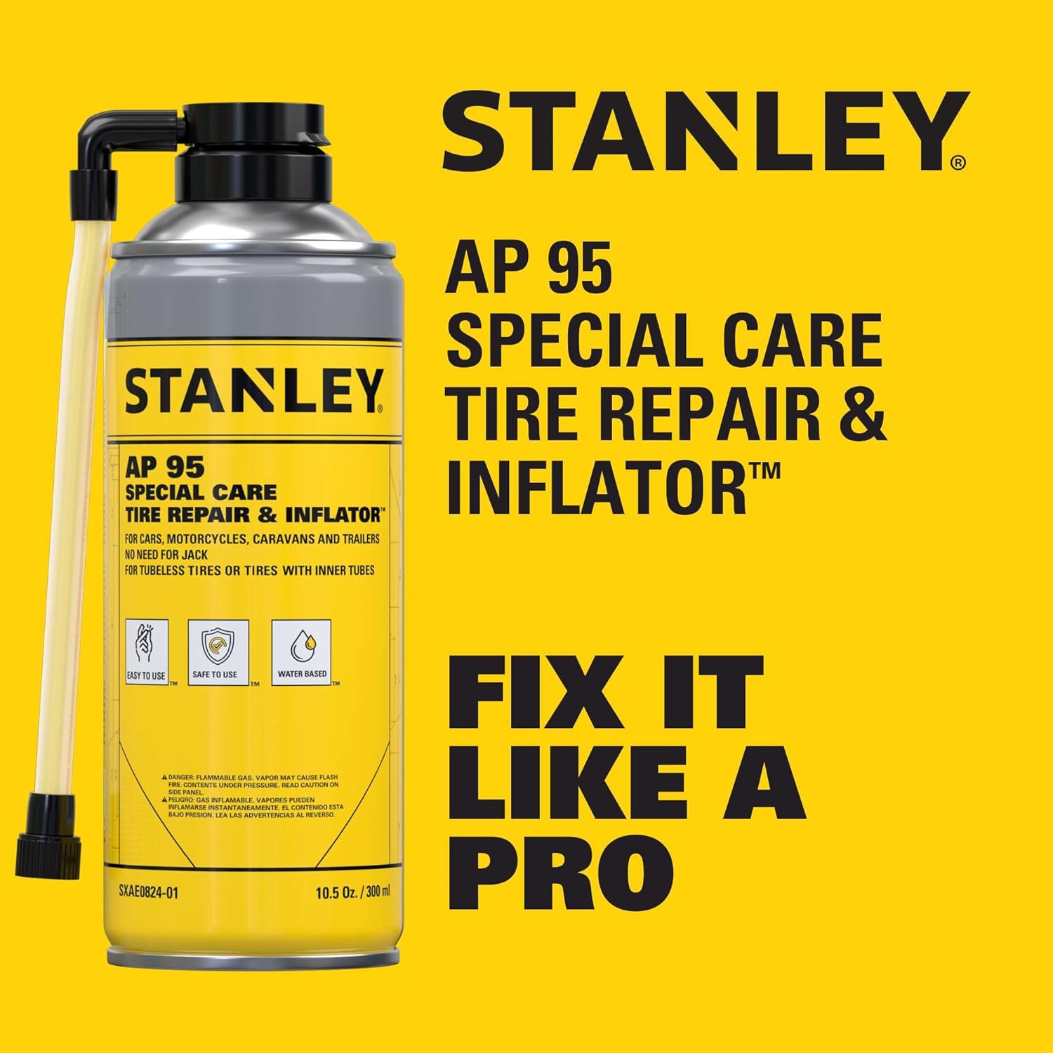 Stanley AP 95 Tire Repair & Inflator is your go-to solution for fast, tool-free tire repair on the road. Whether you're driving to work or traveling off-grid, this emergency sealant spray instantly seals and inflates tubeless tires, helping you get back on the road in seconds, without using a jack or removing the tire. Engineered for cars, motorcycles, bikes, trailers, and more, the high-performance foam formula seals punctures from the inside and inflates the tire to 1–2 bar pressure. Ideal for punctures, rim leaks, and sudden flat tire situations, it enables safe driving up to 31 miles at moderate speed so you can reach the nearest service station. Its eco-friendly, water-based formulation is safe for valves and rims, leaves no sticky residue, and requires no cleanup tools. Perfect for storing in your trunk or glove box, Stanley AP 95 is an essential tire emergency solution for all drivers.
