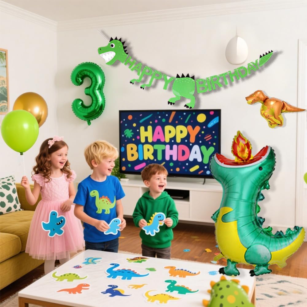 Transform your little one's third birthday into a prehistoric adventure with this comprehensive Three Rex dinosaur party decoration set! Perfect for creating an unforgettable celebration, this all-in-one kit includes everything you need to set up a roaring good time. The centerpiece features eye-catching THREE REX letter foil balloons and adorable dinosaur-themed foil balloons in various sizes, complemented by a festive "Happy Birthday" banner. The kit comes with 60 coordinating balloons in fruit green, pearlescent aqua blue, and confetti designs, plus a special number "3" foil balloon. Two green party fringe curtains add depth to your party backdrop, while the 16-foot balloon arch kit helps create a stunning entrance or photo opportunity. The set also includes practical party essentials - 10 seven-inch plates with matching green forks for serving birthday treats. Complete with 100 glue points for easy assembly and fun dinosaur stickers, this party package delivers the perfect balance of prehistoric charm and modern party style.