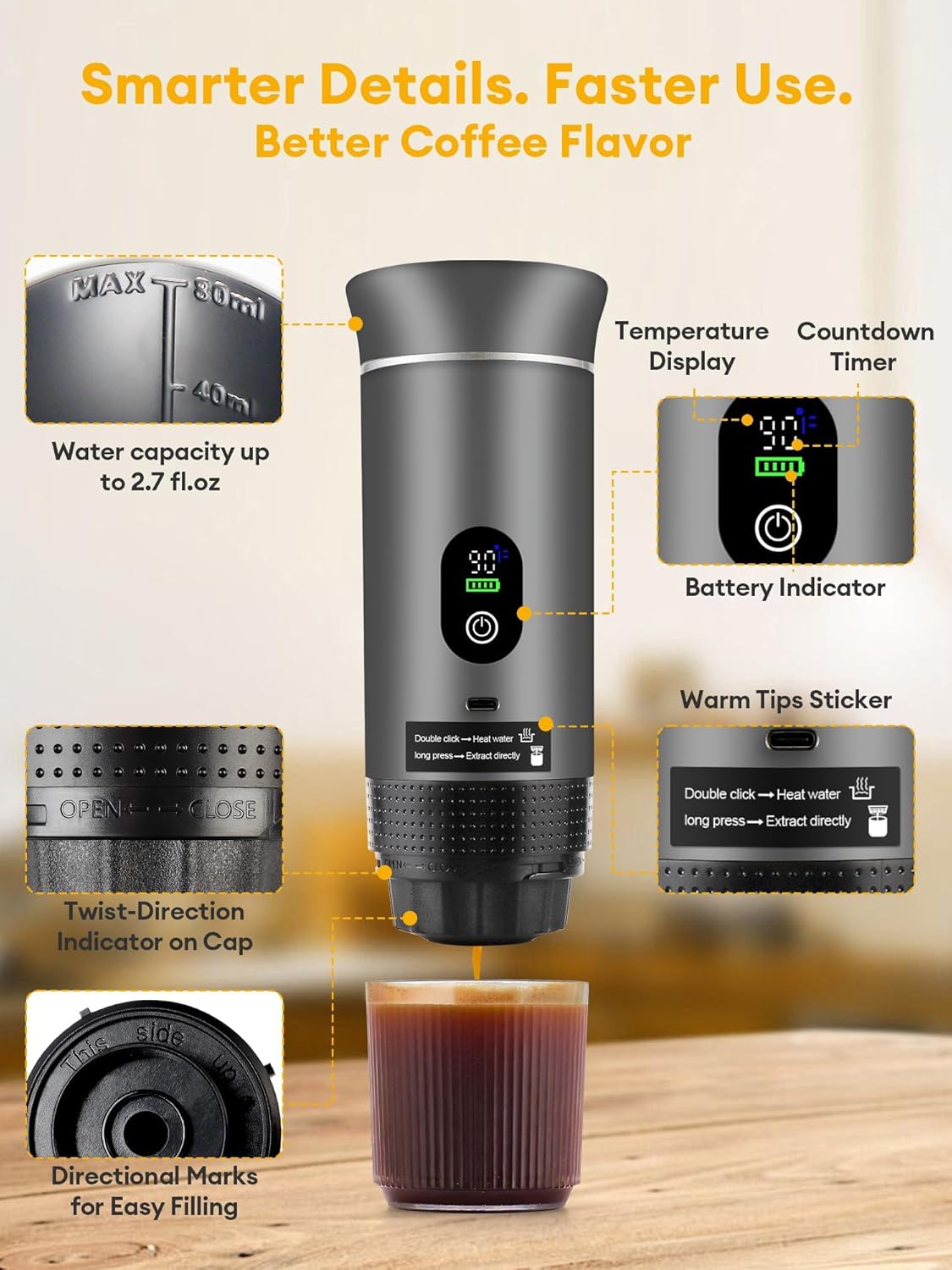 | Other Special Features of the Product | Easy of use, Heat transfer, Portable Lightweight, Self-Heating, single-serve brewers, mini espresso machine,compact coffee maker, self heating car coffee maker, camping coffee maker, personal coffee maker |