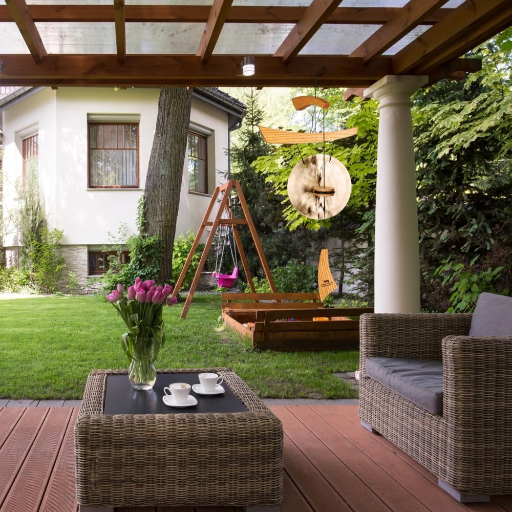 Product Description Inspired by traditional Asian design, our Emperor Series offers wonderful sound and is intended to reflect balance, harmony, grace and beauty.Chinese instrument makers have made gongs for thousands of years and are deserving of their reputation of making the best in the world. Many processes go into creating the special sound of a Chinese Gong, including fine toning as a result of hand-hammering.In Buddhism, the gong is sounded at the start and end of each day. In Chinese temples, gongs are struck 108 times because it's believed that sentient beings have 108 types of worries. The teaching is this upon hearing the gong, worries will cease, wisdom will grow.Nothing has the ability to transport us to another time and place quite like the brilliant resonance of a gong. For over a thousand years, gongs of various types have played an important role in both the religious and secular music of many Asian cultures. Gongs were sounded to chase away evil spirits, warn of invading armies, heal the sick and invoke the spirits of the dead. To be touched by a gong was said to bring happiness and strength. Today, this revered instrument of warriors, emperors, princes and priests adds a special aura to any setting. Handcrafted using traditional methods, Woodstock Gongs bring the ancient wonders of the Far East home. WOODSTOCK CHIMES THE ORIGINAL MUSICALLY TUNED CHIME. In 1979, the first Woodstock Chime was created by GRAMMY® Award-winning musician Garry Kvistad from an aluminum lawn chair he found in a landfill. As a professional musician and instrument designer, he was fascinated by the Scales of Olympus, a 7th century pentatonic scale that can't be played on a modern piano. Garry had the idea to cut and tune the lawn chair chime tubes to the exact frequency of the ancient scale. The resulting Chimes of Olympus was the first Woodstock Chimes Wind Chimes and is still one of our bestselling wind chimes. Amazon.com Inspired by a blend of traditional and contemporary Asian aesthetics, this gong has a graceful, fluid design. A polished 10-inch brass gong hangs from sweeping arcs of ash wood, and produces a deep-throated harmonic ringing as it is rung by the round, rubber-edged striker. Secured with black nylon strands, the Emperor Gong is weather-resistant, measures 34-1/2 by 13 inches, and, in addition to providing calming wind-music, is useful for signaling the start of dinner or meditation. Musician Gary Kvistad founded Woodstock Chimes in 1979, and today the family-owned company produces a wide range of handcrafted, precision-tuned chimes. A one-year warranty covers the gong against defects. --Ann Bieri